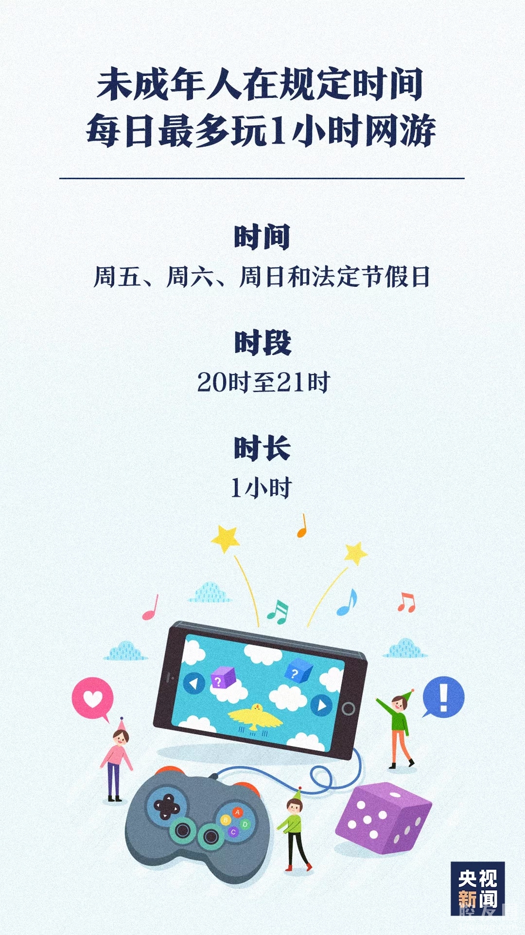 所有网络游戏企业仅可在周五、周六、周日和法定节假日每日20时至21时向未成年人提供1小时服务,其他时间均不得以任何形式向未成年人提供网络游戏服务;