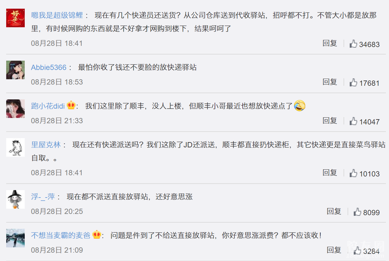 这一派件费的上调,能直接进入快递员手中吗?申通快递表示,严令网点必须严格贯彻落实政策,不打折扣地惠利到快递员。此外,中通方面也规定上涨的派件费将直发到派件业务员掌中通app,全国所有中通网点现有支付业务员的派件费标准不得下降。据界面新闻记者多方了解,近一两年,各大品牌的末端派件费都有所下调。北京市一位从业多年的快递员表示,目前自己拿到的末端派件费已经从此前的1.8元/票下降至1.4元左右。在快递价格战比较激烈的3、4月份,末端派件费下降的情况更为频繁,几乎是一个月降2毛。为了平衡派件费下降和快递员受益的问题,一些地区开始整合不同品牌的网点,实行共配模式。即同一批快递员承担多家快递企业的配送任务,随之一个快递员每天负责的派件数量增加了不少,配送效率得到提高,冲抵了一部分派件费下降的损失,但负责的区域也减少了,对快递员的整体收益并没有太大助益。快递加盟商魏师傅则认为,提涨末端派件费是“薪水留人”的重要体现:“每年春节过后,以及618、双11之前,快递岗位都非常缺人,流动性也很大。”魏师傅告诉记者,实行提涨终端派件费这样的涨薪政策,势必将对稳定快递员的工作信心起到明显作用。除了薪资保障问题得到重视以外,《关于做好快递员群体合法权益保障的工作意见》也对快递员的社会保障问题提出了要求,比如要给快递员提供工伤保险、人身意外保险等险种。消费者:快递能送到家吗对于这个消息,消费者怎么看?上万人的意见集中在“现在快递小哥都不派送到家,直接放驿站,怎么还好意思涨派件费”。
