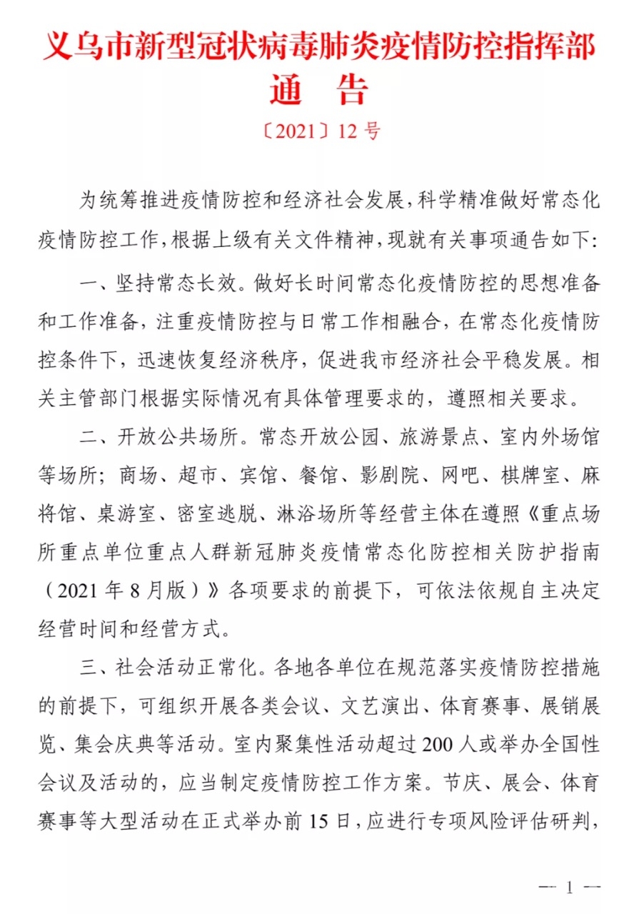 义乌市新型冠状病毒肺炎疫情防控指挥部通告(2021年第12号)