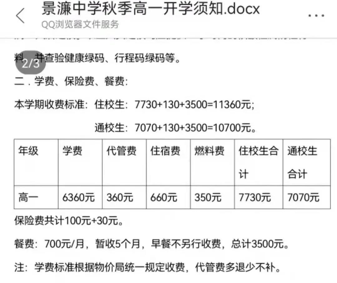 7月份,参加完新生军训后,陈先生就一直等通知开学,不知道什么原因,学校最后通知6号才开学,而在开学前一天,老师发在班级内的收费标准让家长们炸了。按照通知,高一新生新学期的收费标准为,住校生:7730+130+3500=11360元,通校生7070+130+3500=10700元。