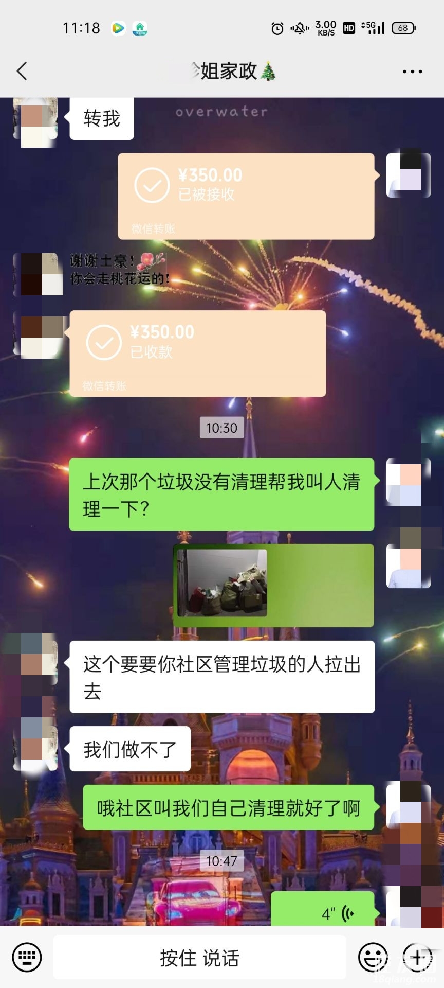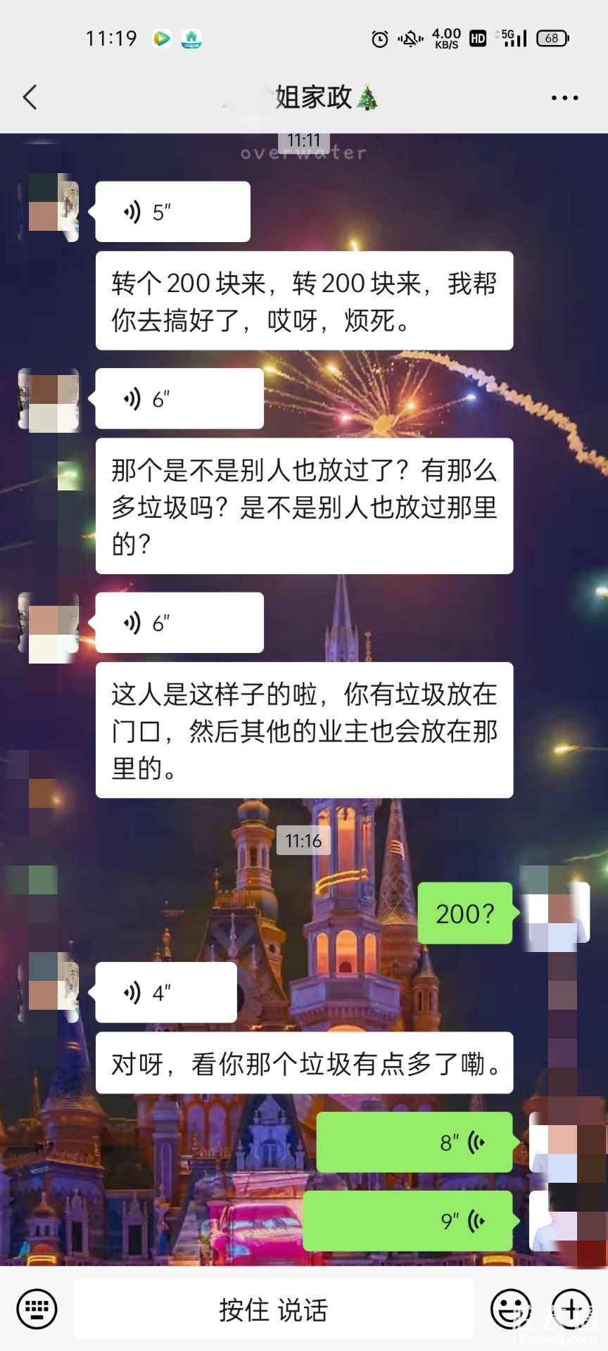 情况是这样的:一个房东委托我帮他卖房子,我带客户去看。因为久了没住有点儿脏,于是委托家政帮我打扫一下。情况和他说过114平的房子然后久了没住有点儿脏。然后谈好价格50一个小时。打扫完后我让拍个房子视频。因为我没时间过去看。在外面带客户看房子。让阿姨拍了房子视频给我我看了一下就把钱转过去了。今天房东发微信给我说楼上楼下业主投诉垃圾没有清理掉。我给家政说要不你找人去打扫下,上次没丢掉。我一样给钱。然后家政和我说让我转200再。我气就不打一处来。你没弄好的事情还这么理直气壮