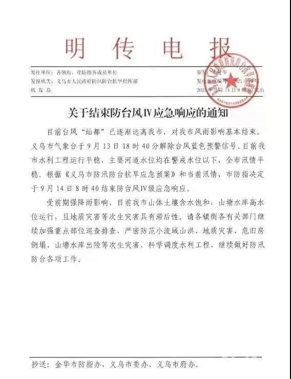 据义乌市人民政府防汛防台抗早指挥部9月14日8时40分发出的《关于结束防台风IV应急响应的通知》,目前台风“灿都"已逐渐远离义乌,对义乌风雨影响基本结束。