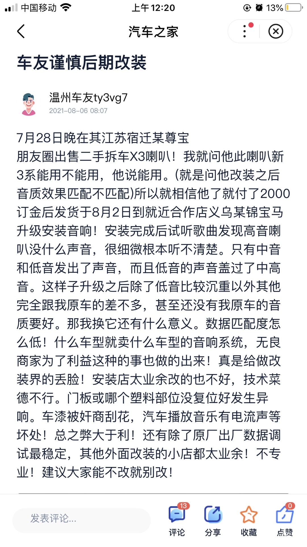 本人前段时间在义乌某锦宝马改装店改汽车音响,我是看到抖音里专业改宝马才去的,谁知道接触下来就是一个坑店,不是一般的坑,还专业,连用什么音响都不懂的人,满满的套路,满嘴跑火车,老板娘是认钱不认人的,所以一人坑总比大家坑好吧,提醒改汽车音响的朋友请注意,义乌改音响好的店很多,别被这家给坑了