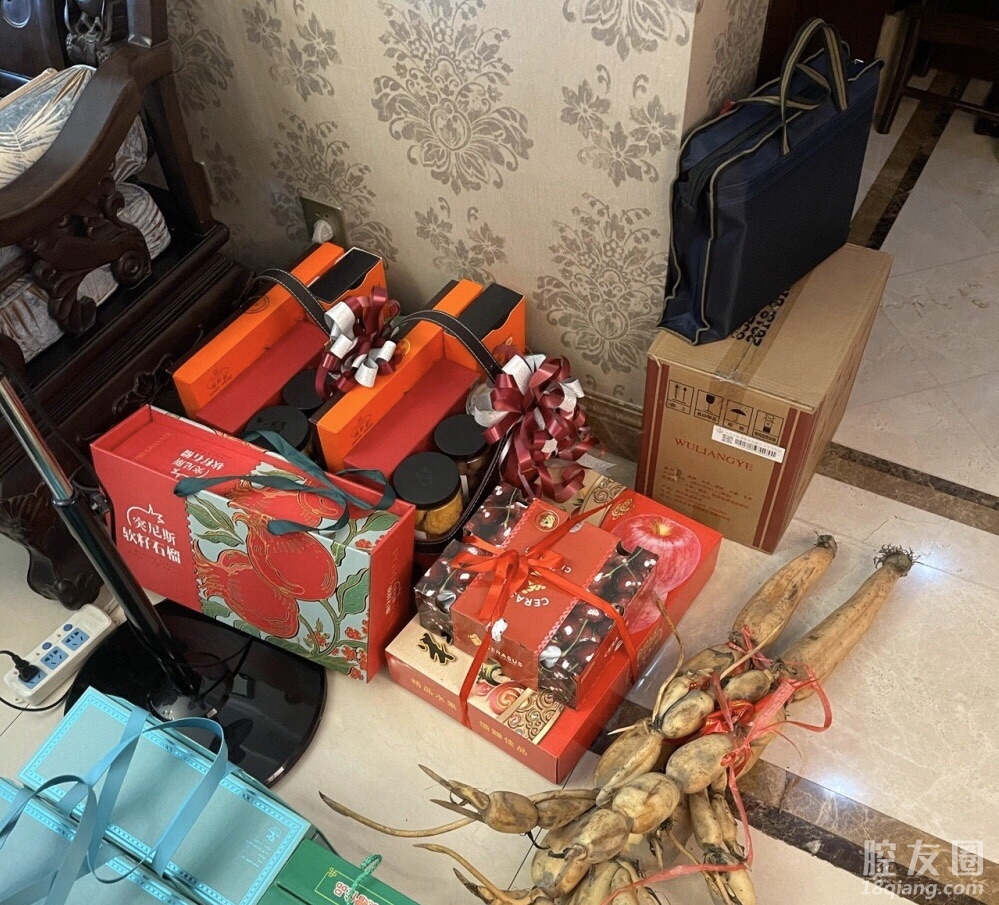 一箱五粮液、五条黄金叶、还有大礼包 (银耳 枸杞 蜂蜜 坚果 普洱等等)、一箱苹果、一箱石榴、一箱车厘子、两条lv的围巾、 一箱月饼、还有藕,寓意佳偶天成哈哈哈哈哈