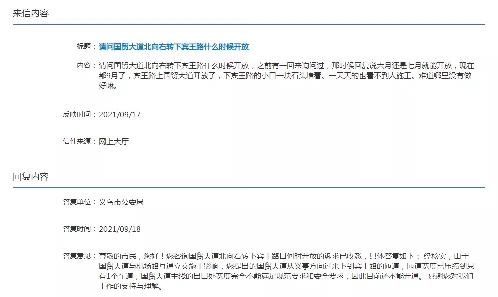 日前,有市民在浙江统一政务咨询平台询问国贸大道北向右转下宾王路什么时候开放?