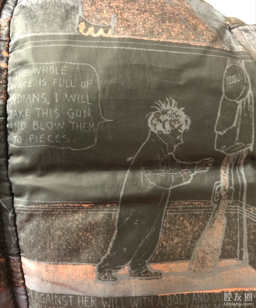 比如很多箭射向一个人!还有英文“这里都是印第安人,我要用枪把他们都弄碎!”“到地狱!”之类很多血腥文字,这算是暴力软影响,恶文化渲染吧~怎么可以出现在孩子的衣服上