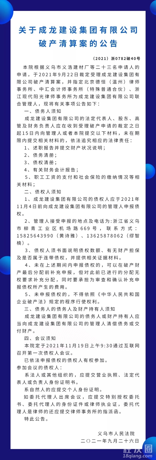 关于成龙建设集团有限公司破产清算案的公告