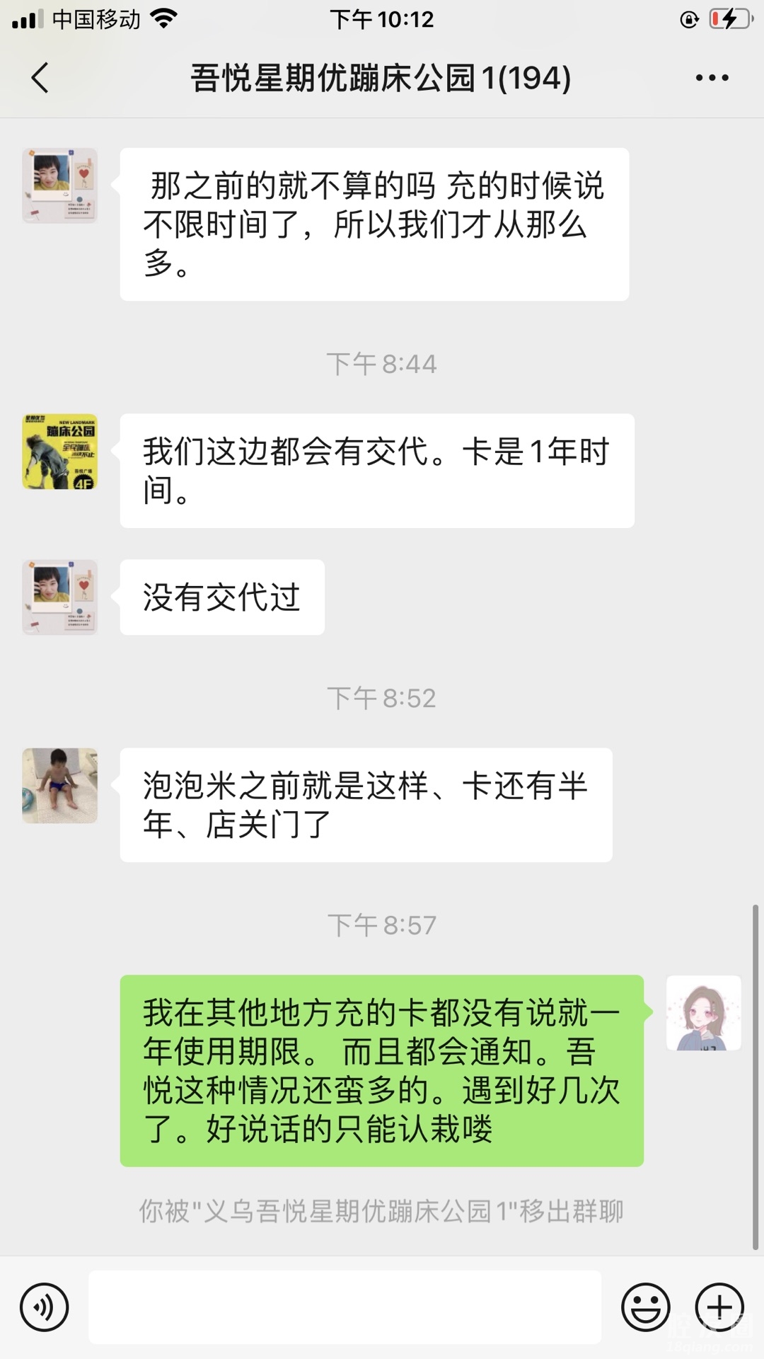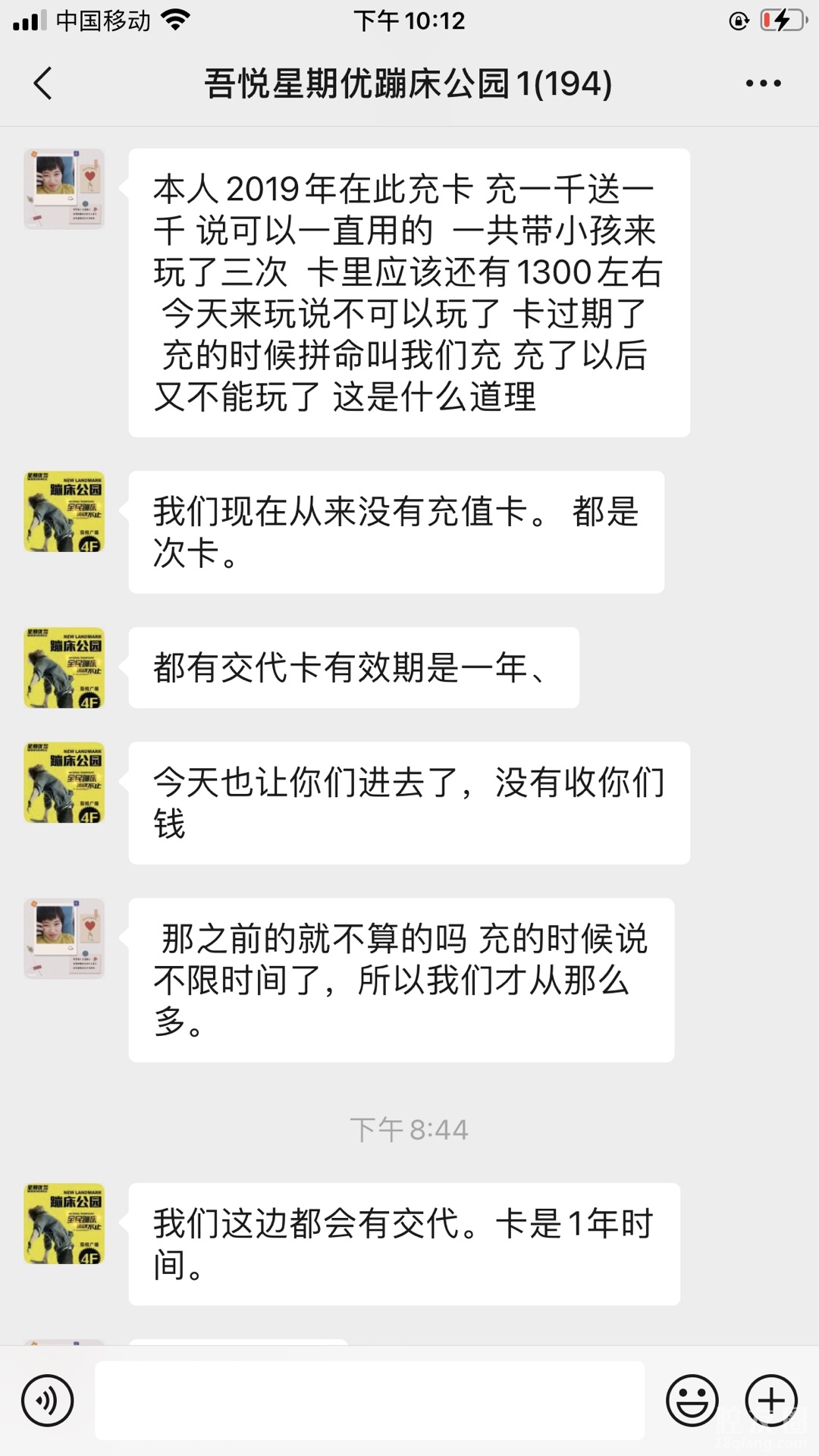 吾悦四楼蹦床公园欺骗消费者,理亏了吧,把我踢出群,起初充了一千送一千,不限时间,一共玩了三次,卡里余额应该有一千多,今天去被告知不能玩了,说是换了老板,现在一口咬定就说充卡限期一年内玩掉,但是没有提前告知我使用完,今天去了前台还说谎,说我只充了500,我分两次各转500,有转账记录,他们店很坏,每次消费都没有提醒,但是电脑上的记录你们自己很清楚,在这里我想问一下,哪一家店说是充卡限期一年的?这样的的店谁还敢充值,百度了一下,吾悦这种情况挺多的,奉劝大家一句,理性消费,千万不要各种充卡