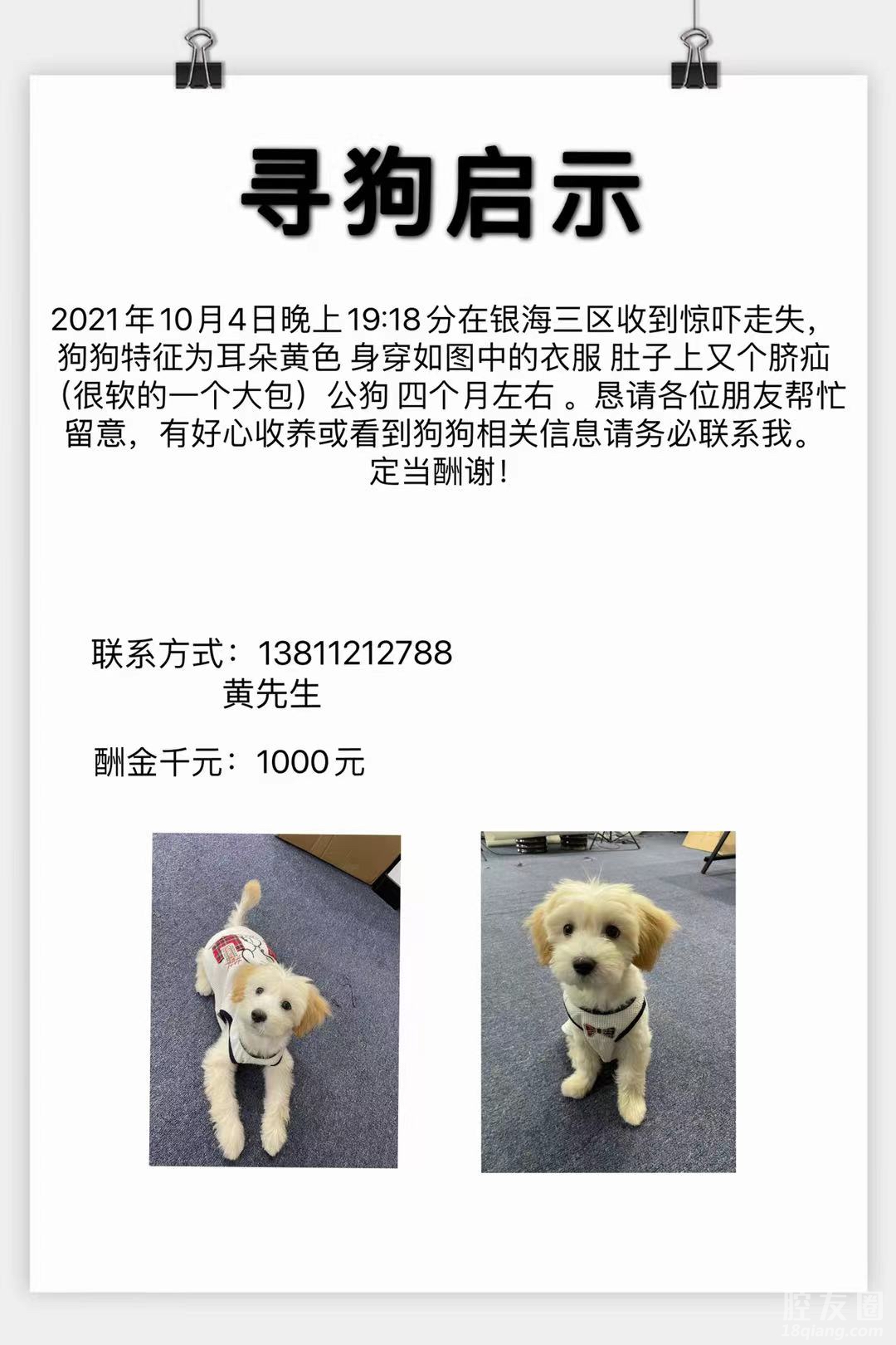 本人在2021年10月4日晚上19:18分在银海三区收到惊吓走失,狗狗特征为耳朵黄色身穿如图中的衣服肚子上又个脐疝(很软的一个大包)公狗四个月左右。恳请各位朋友帮忙留意,有好心收养或看到狗狗相关信息请务必联系我。定当酬谢!