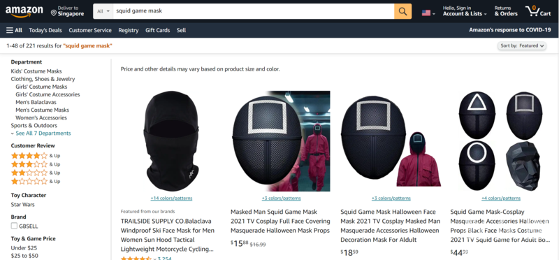 记者了解到,生产一个面罩的成本大概在1.5元左右,在国内电商平台,售价在26元左右,而在亚马逊等平台,同样的面罩售价在15美元左右,利润颇为丰厚,吸引了不少外贸电商入场。在美国亚马逊平台,搜索“squid game mask”,就有200余个搜索结果,但也有外贸电商持不同的看法。