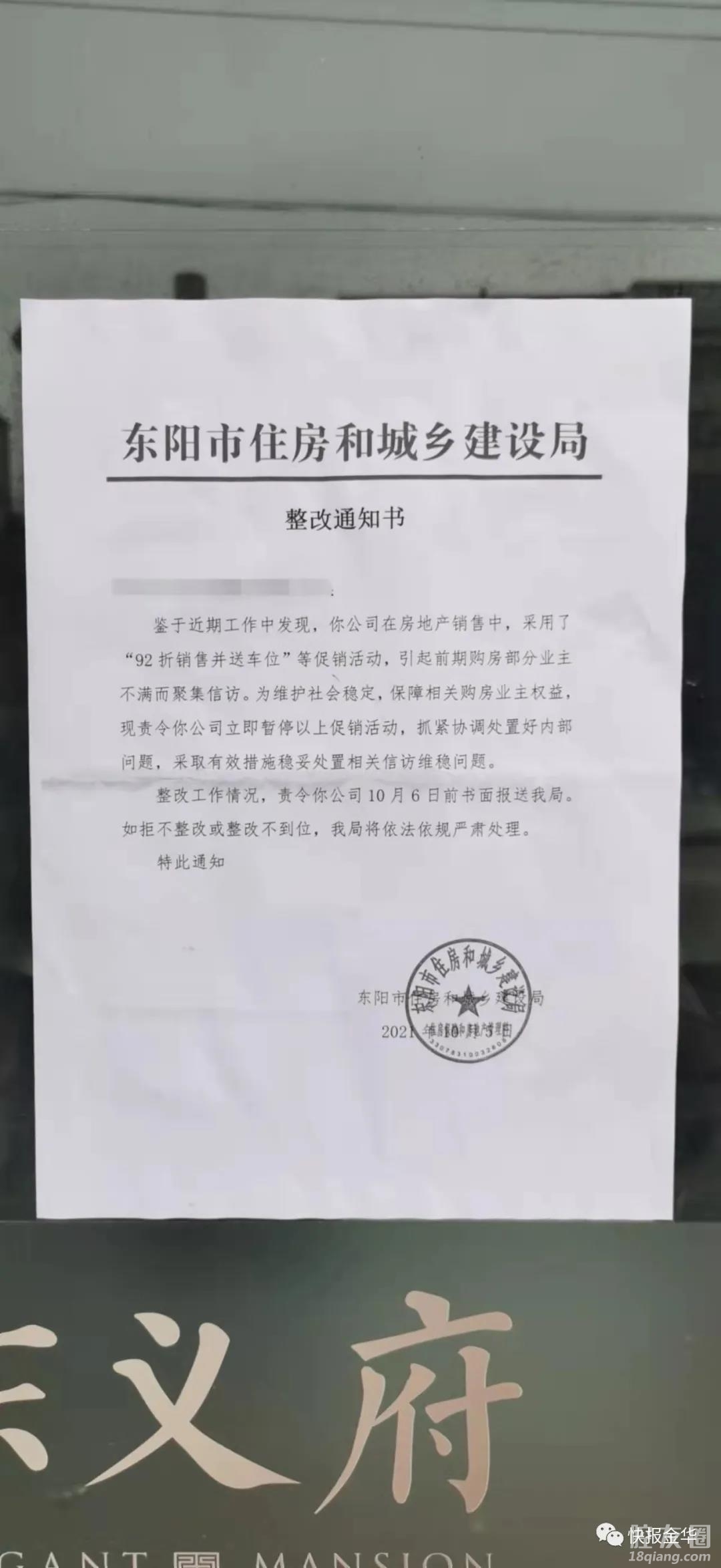 对于此事,东阳住建局也已经发了整改通知书,要求立即暂停促销活动,对于其他问题也在了解调查中。