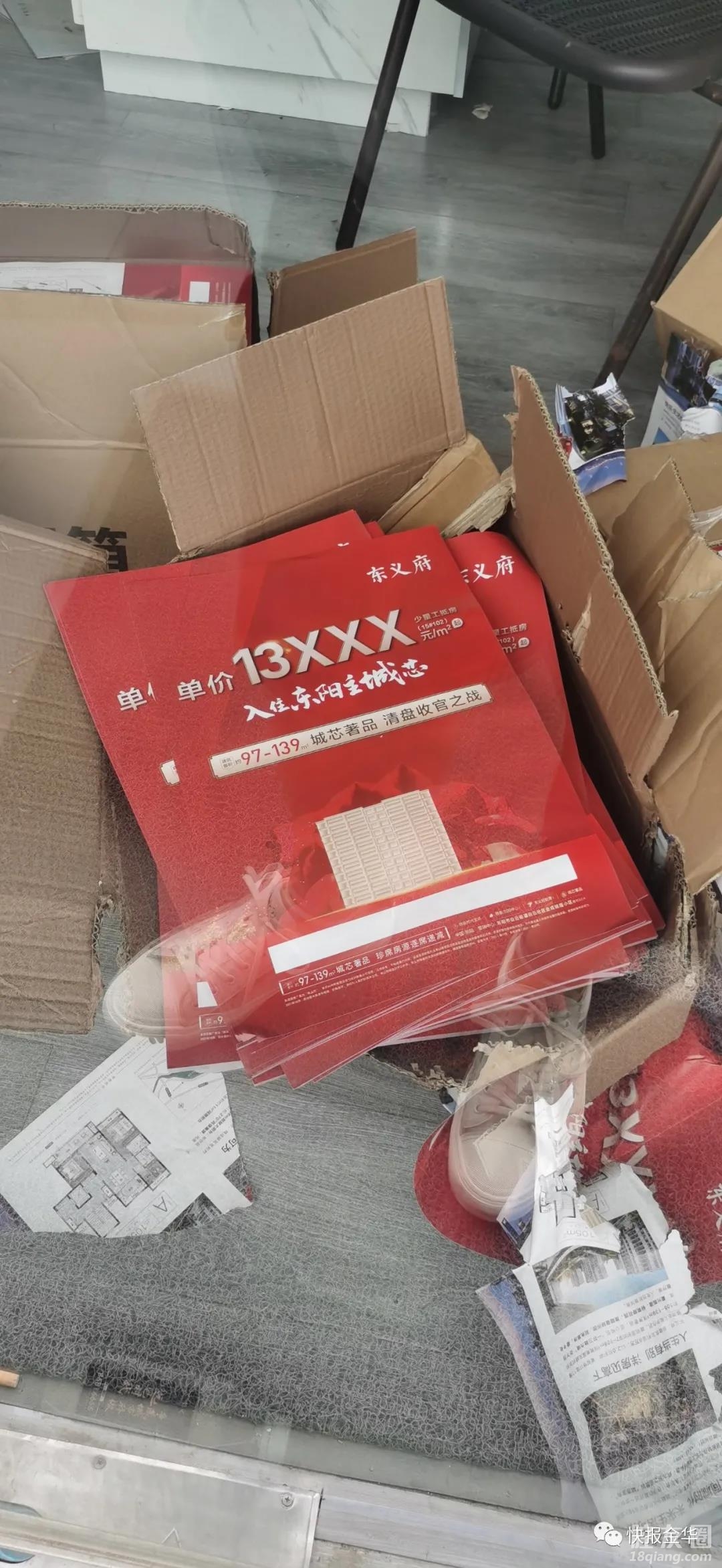 此后记者赶到了位于东义路边上的东义府展厅,大门紧闭,地上散落着大堆的宣传单,上面写着“单价13XXX起入驻东阳主城芯”,不过单子上还用小号字写着“少量工抵房(15#102)”。