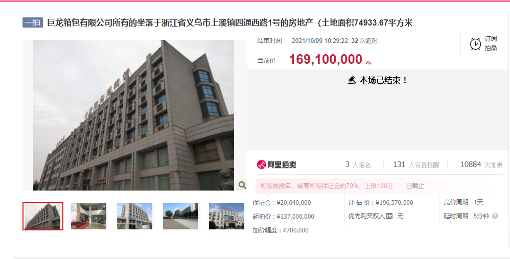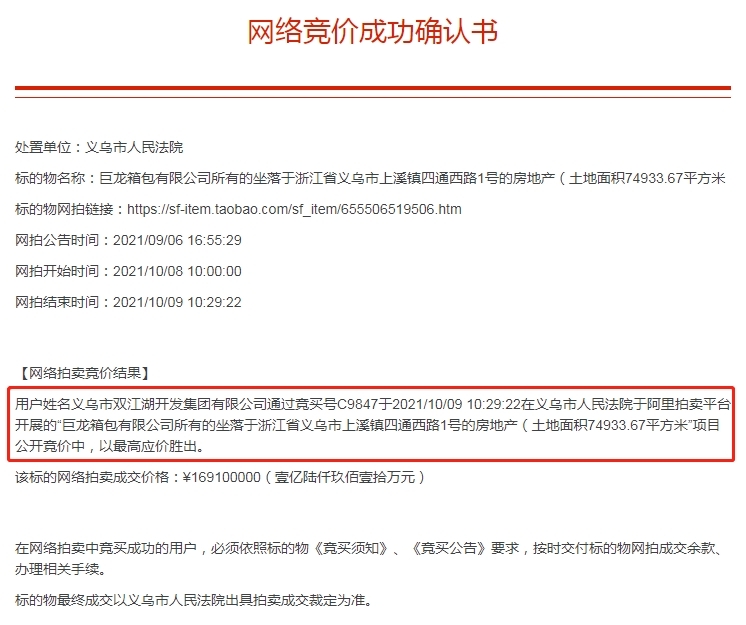 10月9日,在阿里司法拍卖网络平台,经过33轮出价巨龙箱包有限公司所有的坐落于浙江省义乌市上溪镇四通西路1号的房地产以1.691亿元成交,竞得者为义乌市双江湖开发集团有限公司。