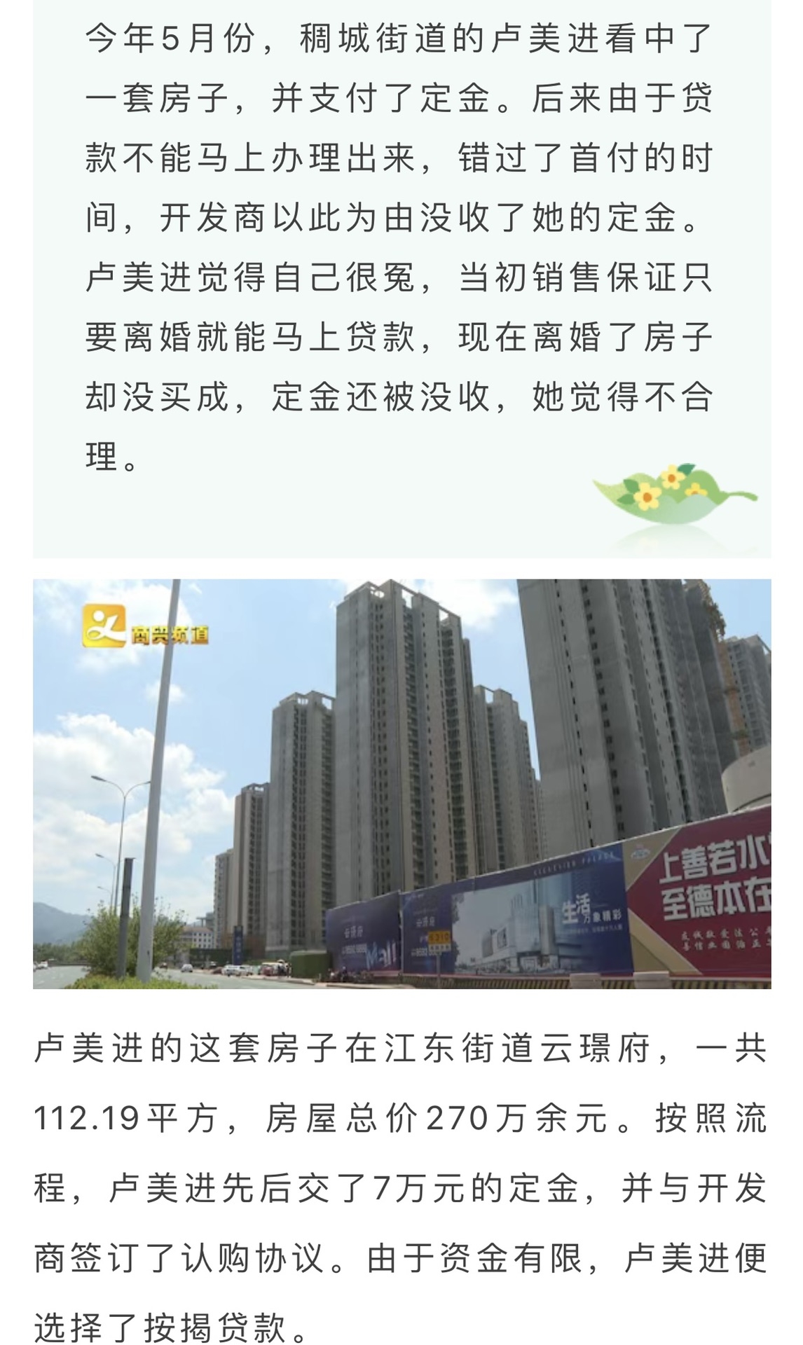 义乌一女子离婚贷款买房,按揭办不出,7万定金被没收!