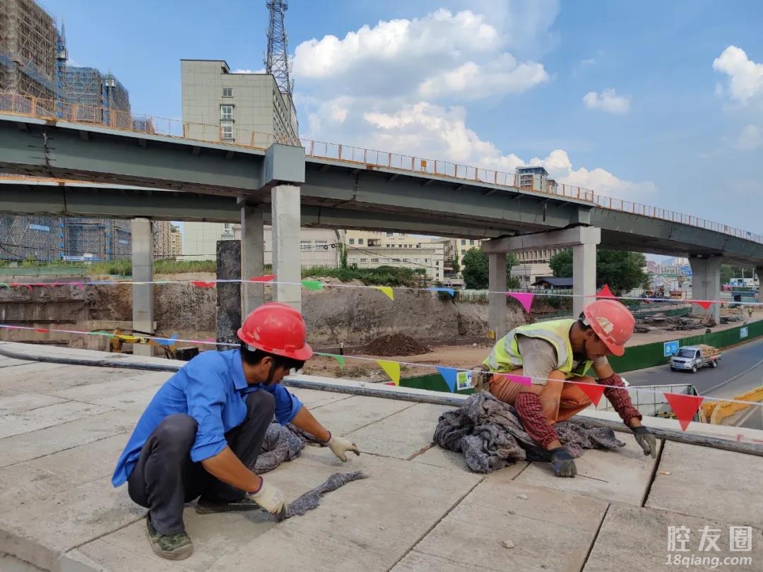 在机场路立交化改造工程三阶段一标现场,车站路桥上数十名工人头顶秋日的骄阳,如火如荼地进行扎钢筋、焊铁板、搬木板等作业,确保在11月底前开通此路段,以方便市民出行。