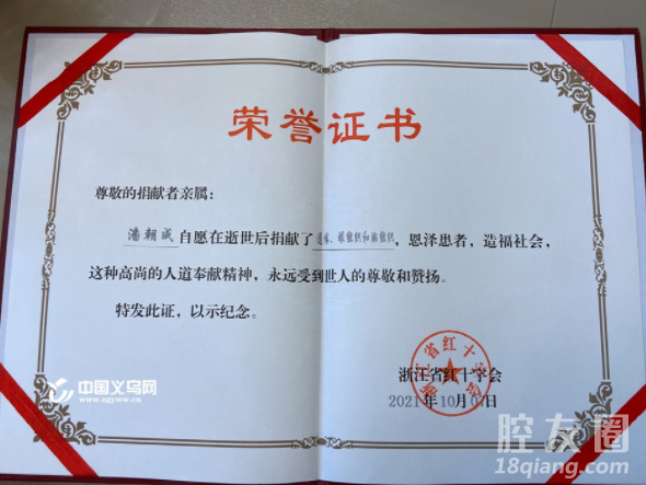 捐献遗体和器官的老人潘朝成是义乌大陈镇里坞村(现并入“众拥村”)人,今年75岁。生前患有严重的肺气肿,今年10月5日病情突然恶化进入浙大四院接受治疗,但情况并不理想,于7日凌晨4时46分离开了人世。