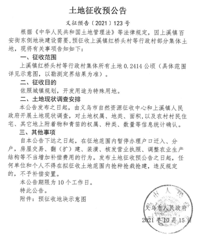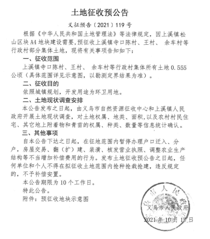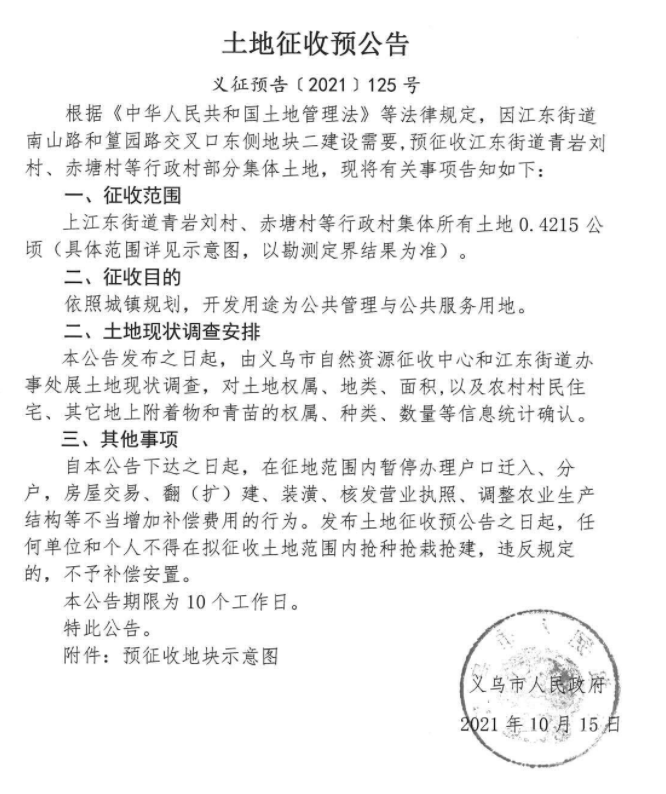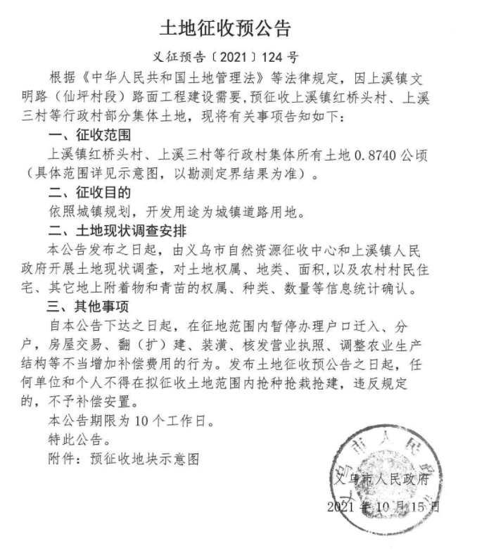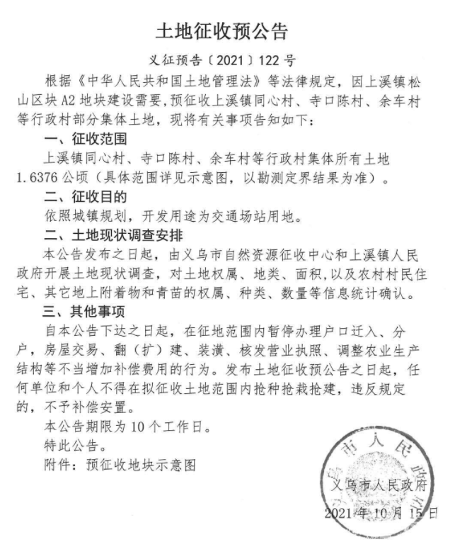 后宅街道依照城镇规划道路与交通设施用地,征收范围稠岩村(三川塘自然村)、李祖村、大傅宅村、陈宅村、方塘村(黄宅自然村、塘下自然村)等行政村集体所有土地21.7474公顷(具体范围详见示意图,以勘测定界结果为准)。 上溪镇依照城镇规划,开发用途为环卫用地,征收范围寺口陈村、王村、余车村等行政村集体所有土地0.555公顷(具体范围详见示意图,以勘测定界结果为准)。 上溪镇依照城镇规划,开发用途为商业服务用地,征收范围同心村、寺口陈村、新民村、余车村等行政村集体所有土地2.0213公顷(具体范围详见示意图,以勘测定界结果为准)。 上溪镇依照城镇规划,开发用途为城镇道路用地、工矿用地、绿地与开敝空间用地,征收范围同心村、寺口陈村、新民村、余车村、王村等行政村集体所有土地23.5422公顷(具体范围详见示意图,以勘测定界结果为准)。 上溪镇依照城镇规划,开发用途为交通场站用地,征收范围同心村、寺口陈村、余车村等行政村集体所有土地1.6376公顷(具体范围详见示意图,以勘测定界结果为准)。 上溪镇依照城镇规划,开发用途为特殊用地,征收范围红桥头村等行政村集体所有土地0.2414公顷(具体范围详见示意图,以勘测定界结果为准)。 上溪镇依照城镇规划,开发用途为城镇道路用地,征收范围红桥头村、上溪三村等行政村集体所有土地0.8740公顷(具体范围详见示意图,以勘测定界结果为准)。 江东街道依照城镇规划,开发用途为公共管理与公共服务用地,征收范围青岩刘村、赤塘村等行政村集体所有土地0.4215公顷(具体范围详见示意图,以勘测定界结果为准)。 自本公告下达之日起,在征地范围内暂停办理户口迁入、分户,房屋交易、翻(扩)建、装潢、核发营业执照、调整农业生产结构等不当增加补偿费用的行为。发布土地征收预公告之日起,任何单位和个人不得在拟征收土地范围内抢种抢栽抢建,违反规定的,不予补偿安置。 本公告期限为10个工作日。