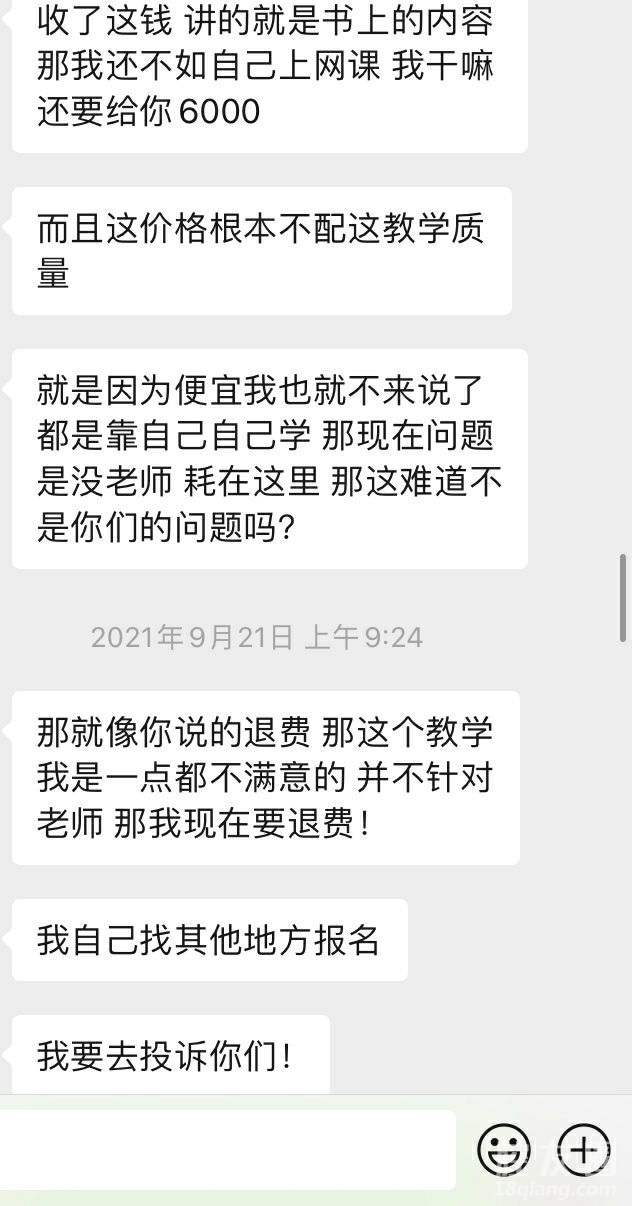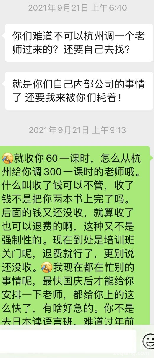 10月6号又态度很差发我信息说起诉我我不想理她就把她拉黑了,但是我还是跟她爸电话联系讲讲道理过的无效!后面她去教育局投诉了,教育局说她属于社会上成年人不归他们管,但是这个人一直投诉所以主持协调一下!结果她当场变本加厉要我赔她12000?日语就我一个人能教吗?不继续给她教对她有什么损失吗?还有这种事情!强买强卖,饭吃完一口都不剩说不好吃退钱,然后还让继续上菜?