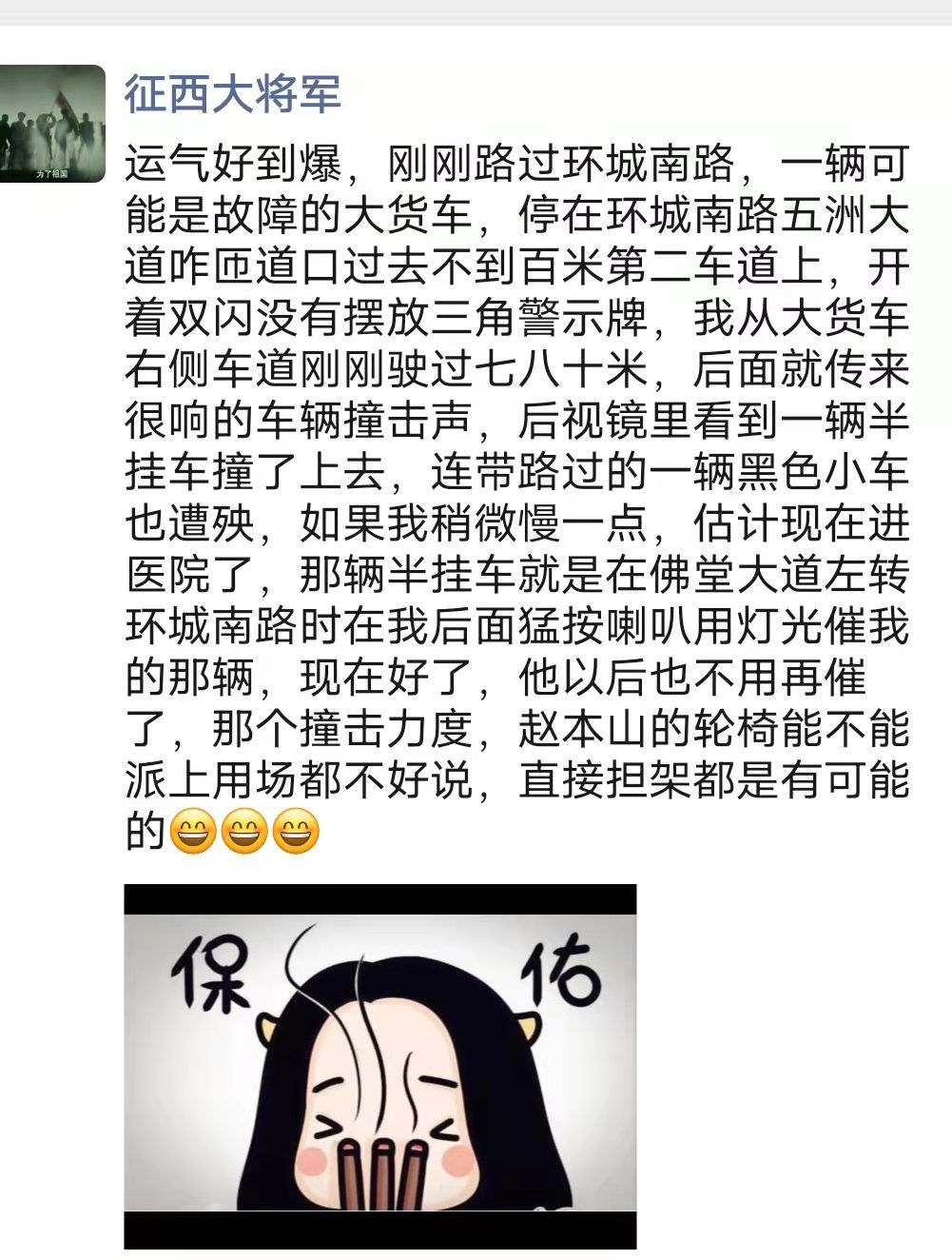 大概八点半左右,老天保佑,运气运气,发个朋友圈压压惊,那辆半挂车那种素质,出车祸是早晚的事情,