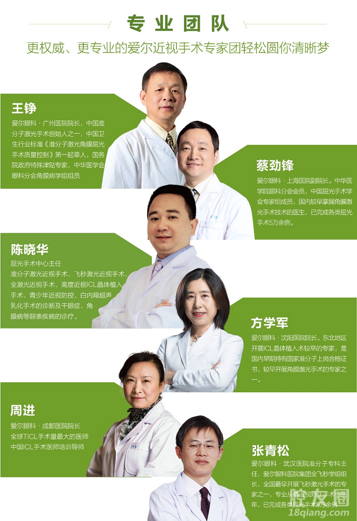 在十九年的创业发展历程中,爱尔眼科凝聚和培养了一批经验丰富、具有开拓创新精神的管理团队和医术精良、治学严谨的眼科专家和医生团队。国家屈光手术标准第一起草人王峥教授领衔的蔡劲锋,张民军,张青松,陈晓华等屈光手术权威专家团队为您保驾护航。