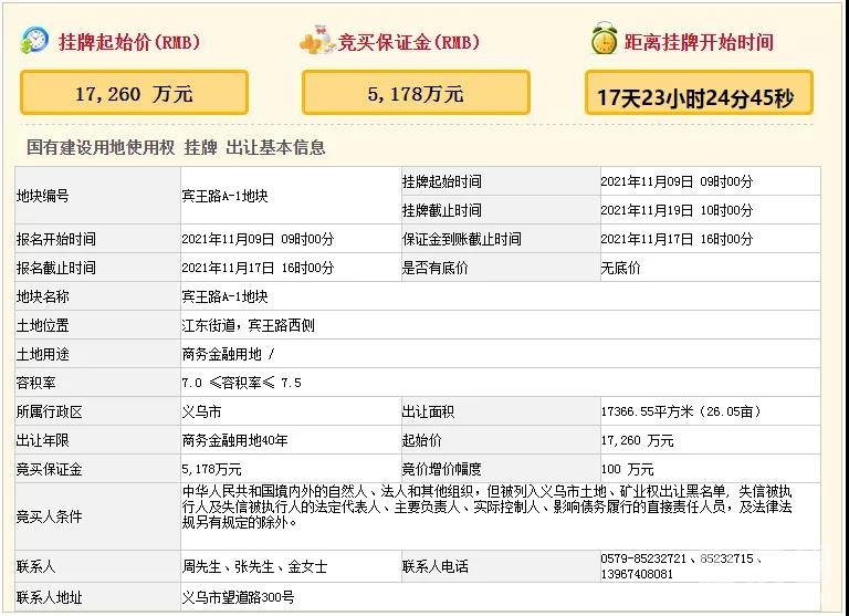 近日,义乌市自然资源和规划局发布公告,宾王路A-1地块即将挂牌出让,该地块为商务金融地块,起始总价17260万元