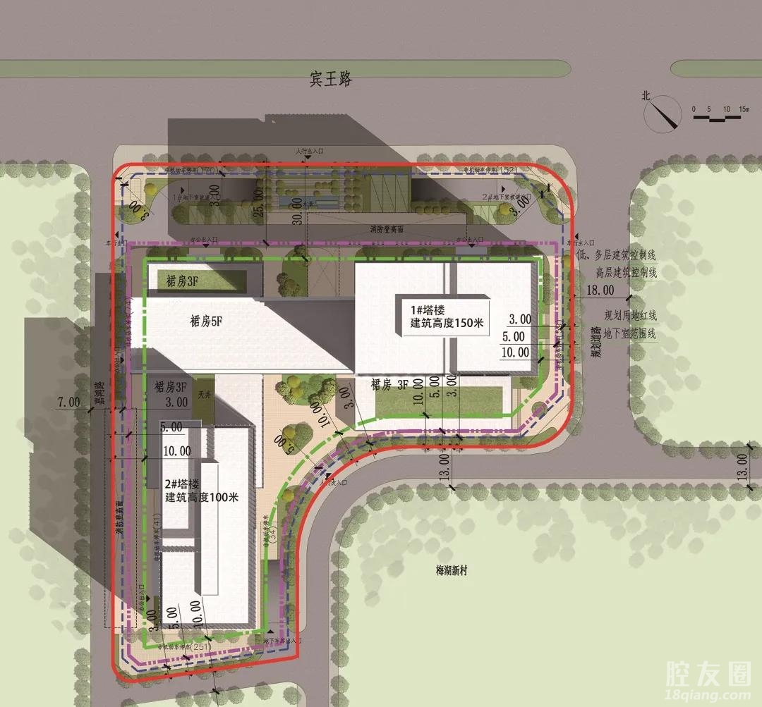 该地块于今年年初进行了规划公示。根据规划,这里将建两幢办公楼,主楼高150m,副楼高100m。地块内建筑将采用公共走廊式布局,卫生间按层集中设置,不得采用单元式或住宅套型式设计,标准层层高不超过4.2m