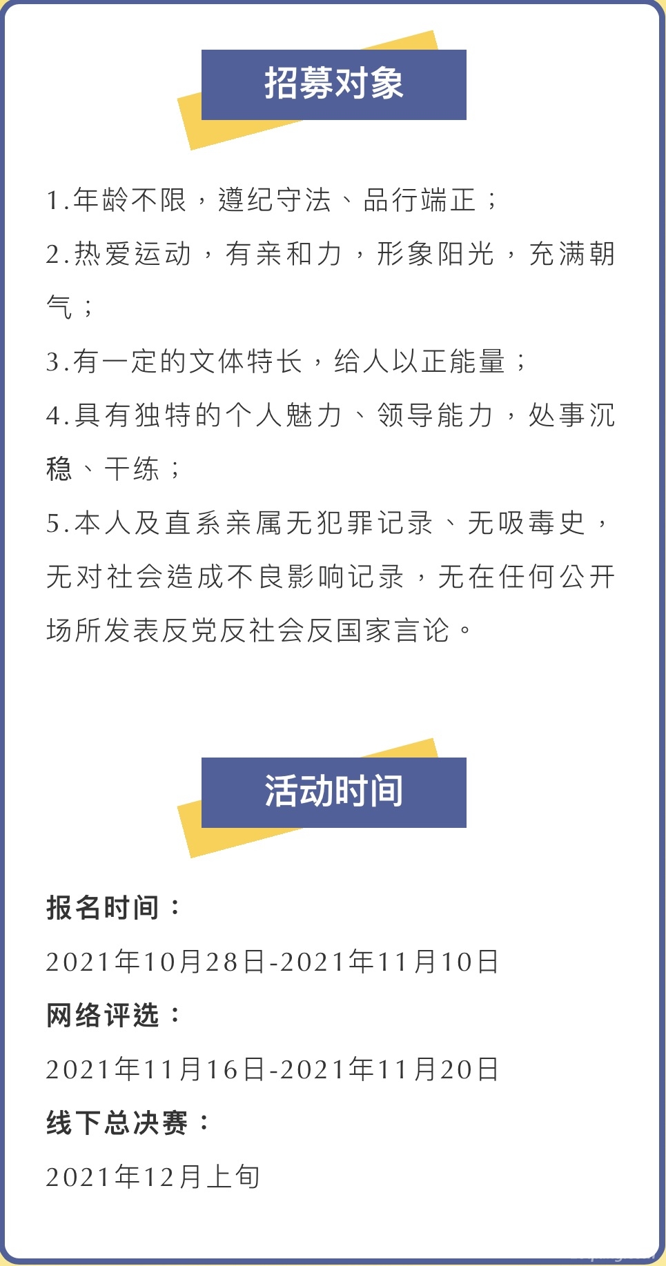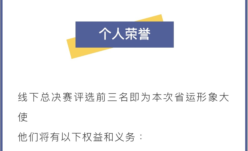 进入复赛的选手,需在一周内(11月28日前)提交命题短视频作品(1分钟内)“假如你是省运会形象大使,你将……”,筹委会将从个人形象、语言表达能力、视频内容创意等方面进行评定,最终确定30名选手进入线下总决赛。作品提交邮箱:358528237@qq.com、307126906@qq.com。