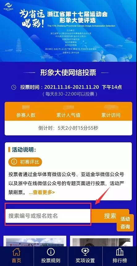 1.初赛评比投票者通过金华体育微信公众号、亚运金华微信公众号以及浙中在线微信公众号的专题页面进行网络票选,投票截止后,人气排行榜前50名选手进入复赛评比。