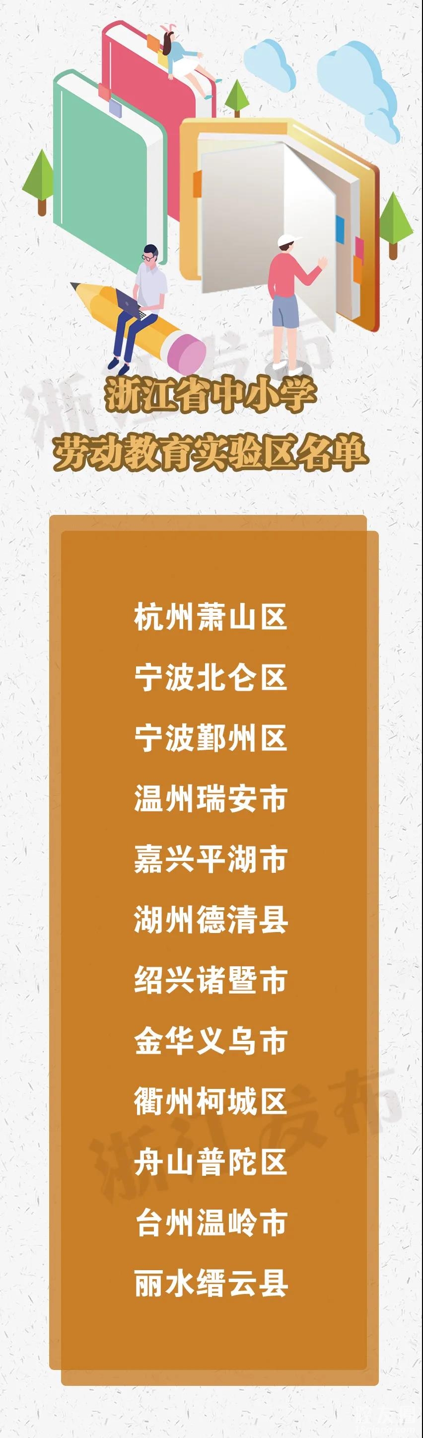 浙江省教育厅办公室近日印发《关于公布省中小学劳动教育实验区名单的通知》,在杭州市富阳区、温州市瓯海区、台州市椒江区被认定为全国中小学劳动教育实验区基础上,经各地申报、专家评审,确定杭州市萧山区等12个县(市、区)为浙江省中小学劳动教育实验区。