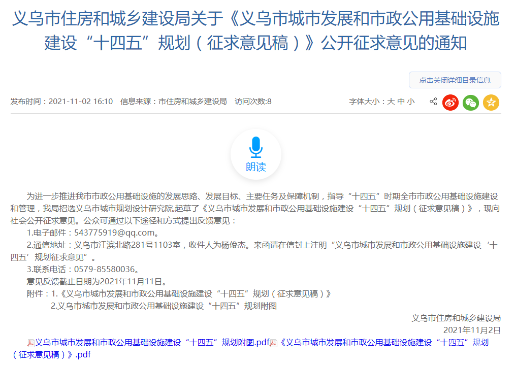 11月2日,义乌市住房和城乡建设局关于《义乌市城市发展和市政公用基础设施建设“十四五”规划(征求意见稿)》公开征求意见的通知发布。