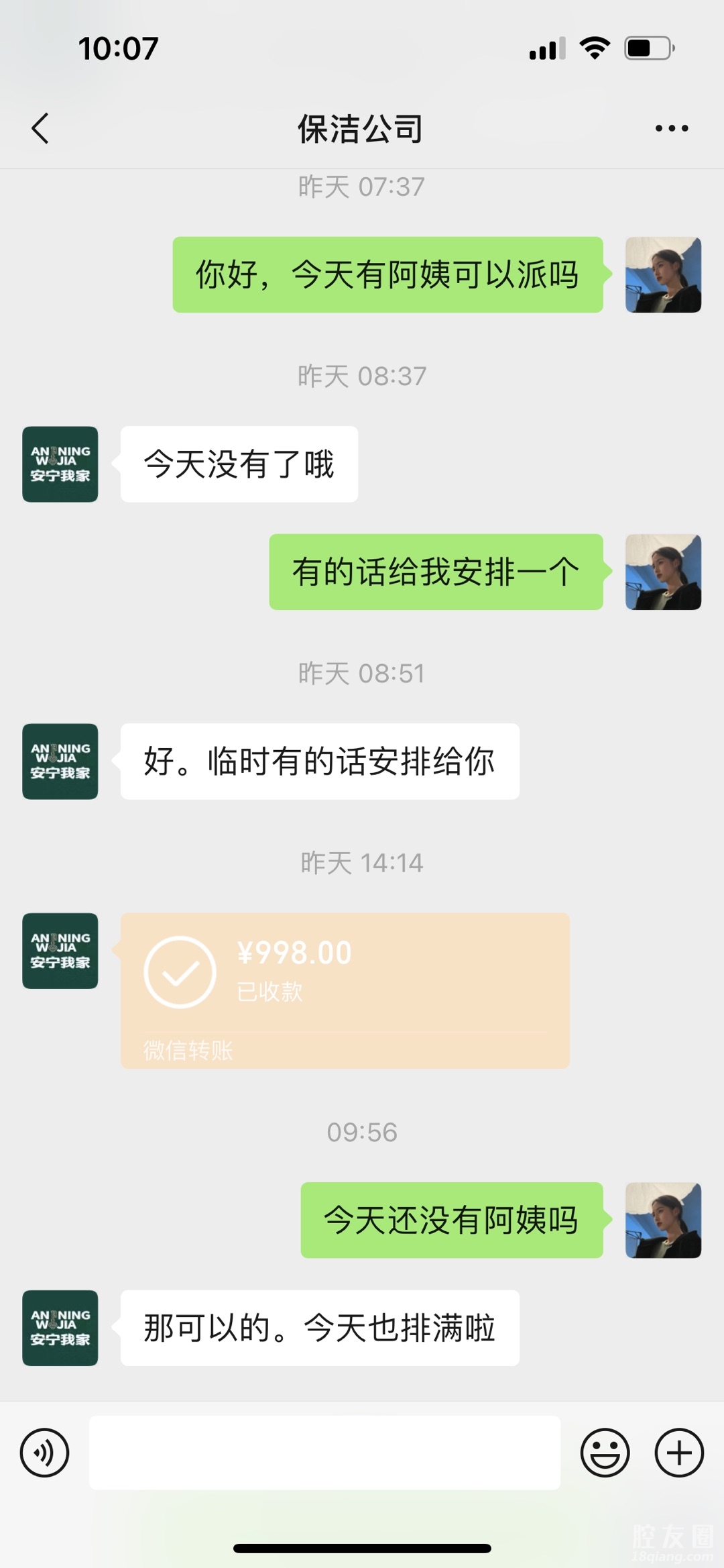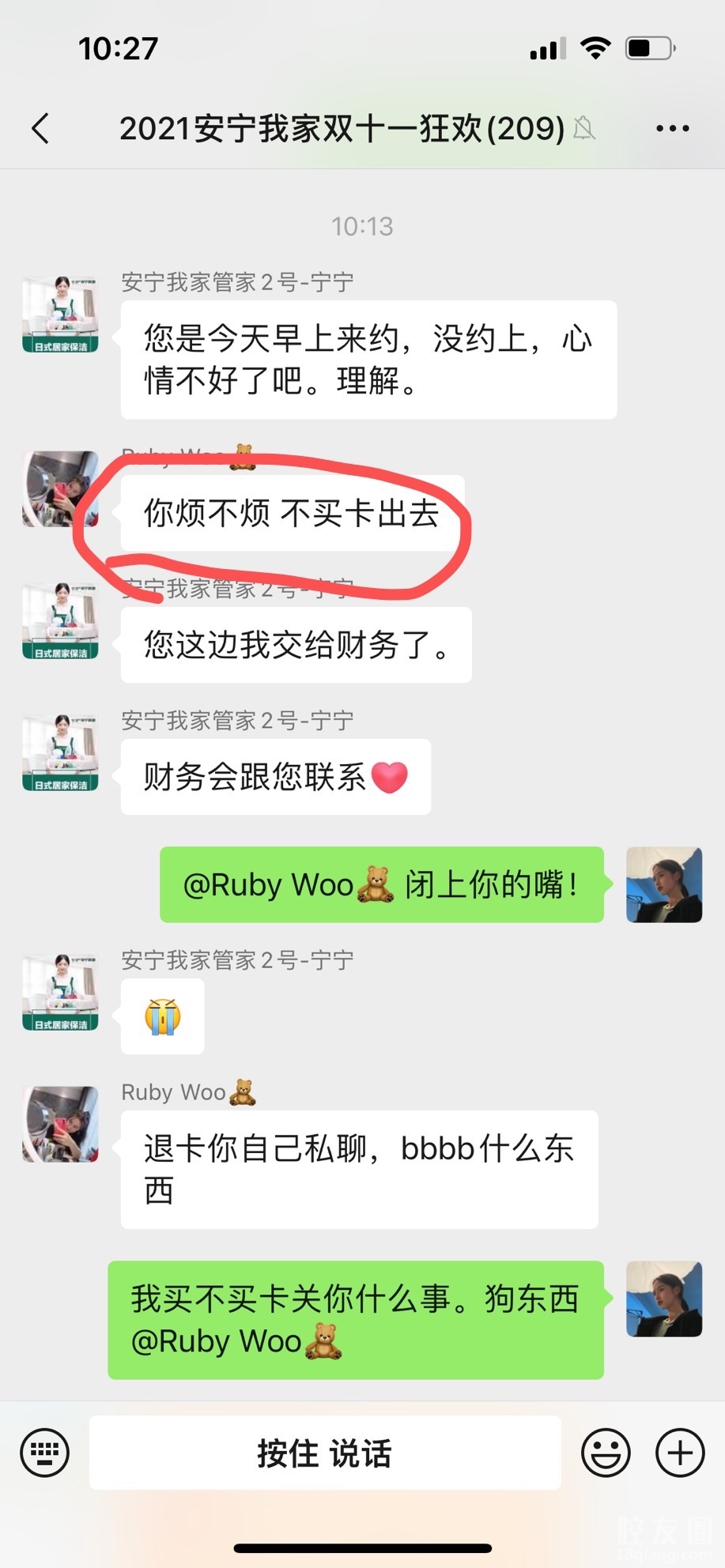 我在他们家买了30次卡,每一次都是约不到阿姨,这次双十一他们又开始搞活动,到处卖卡,里面阿姨就那几个,买卡的朋友们擦亮眼睛,就跟那个理发店一样的,指不定倒闭了,破产了,钱都拿不回来。我就在群里提了约不到阿姨,他们里面的工作人员就恶语相加。我发出来大家不要像我被蒙蔽了眼睛,上当受骗