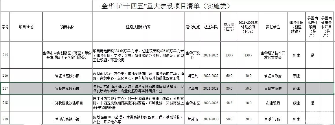 近日,金华市发改委关于向社会公开征求《金华市重大建设项目“十四五”规划(征求意见稿)》意见建议的公告发布。其中,义乌市高铁新城项目入选重大建设项目清单(实施类)。