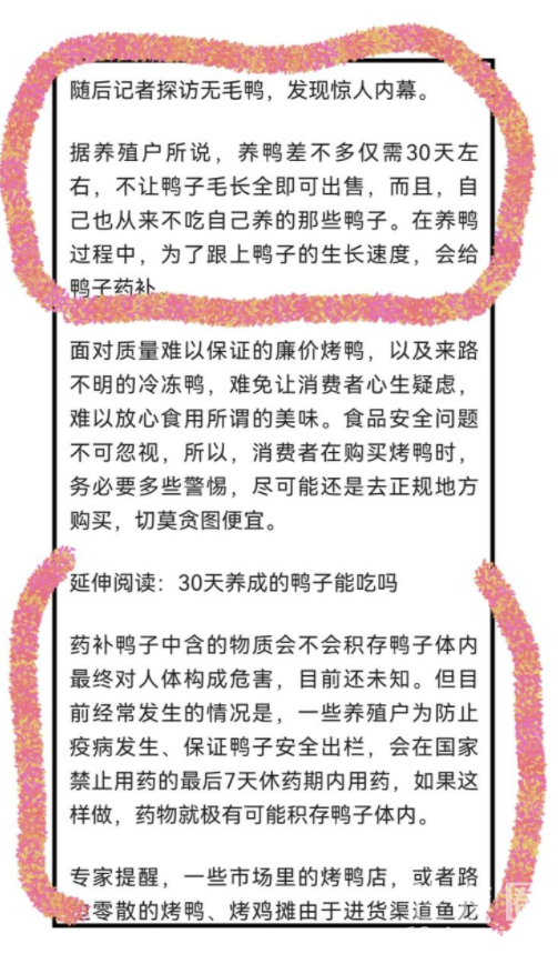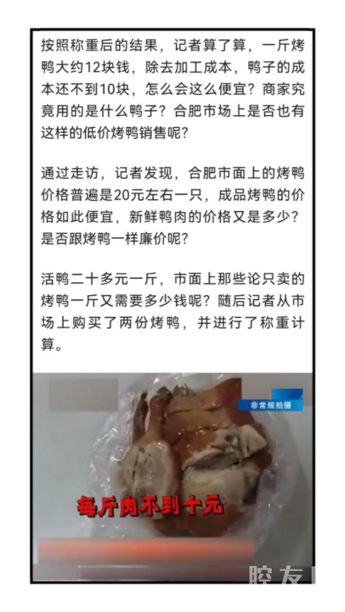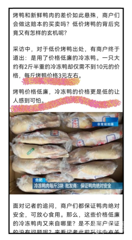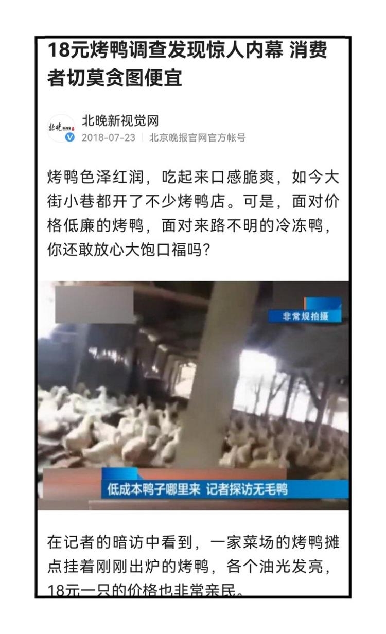 【曝光】今天既然被你恶心到了.搞得男朋友和我大吵一架还要分手. 事情是这样的:今天点了份烤鸭外卖-具体不透露店名-.结果送来男朋友尝了尝说鸭子是冷冻很久的肉都朽的.一股腌制的香精味.问我哪里买的.我告诉他20元一只后就起了争执说这种鸭子吃不得对身体不好.然后就吵了起来..等我回去给闺蜜说起这事.也告诉我少吃不吃.然后问老板居然怼我让我以后去买活鸭自己杀来吃.真是气死了。 我当时只想着便宜看销量也上千.我就买了。后来我网上查了查.不查不知道.一查吓一跳.果真不能多吃. 后来仔细想想.20来元买一只还加工好的.鸭子肯定有问题.既然我遇到了.大家也可以看看.这种确实需要少吃或者不吃.腌制药水很浓.这样掩盖了鸭的味道.听说有的还是冻了很久的病Y死Y药Y.不知道你们都点过这种鸭子吗? 个人观点勿喷.只说个别商家.自己悟吧.建议要买烤鸭的还是买正规一点的。