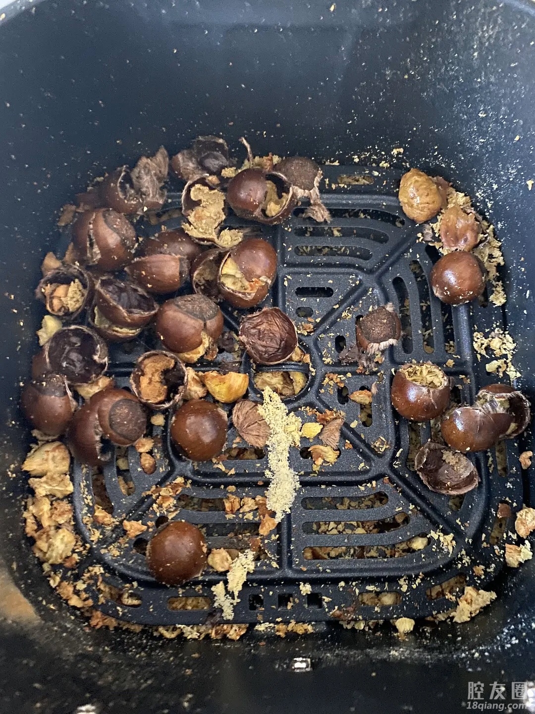 用空气炸锅炸的板栗,我从小红书上找了个教程,说可以不用开口,就图省事没开口,然后就这样了.....粉碎!粉碎!而且我要怎么洗空气炸锅!上面也都是!