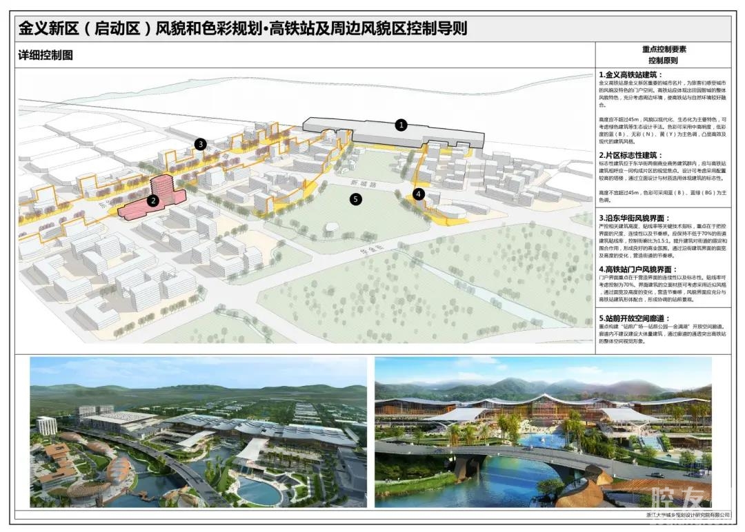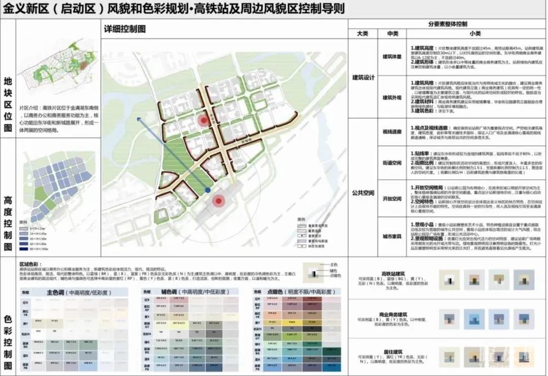 根据规划,金义高铁站限高45m,以高铁站站前广场为重要视点空间,严控相关建筑高度、建筑密度、容积率等关键技术指标,风貌以现代化、生态化为主要特色,色彩可采用高明度、低彩度的蓝、黄为主色调,凸显高效与现代的建筑风格。
