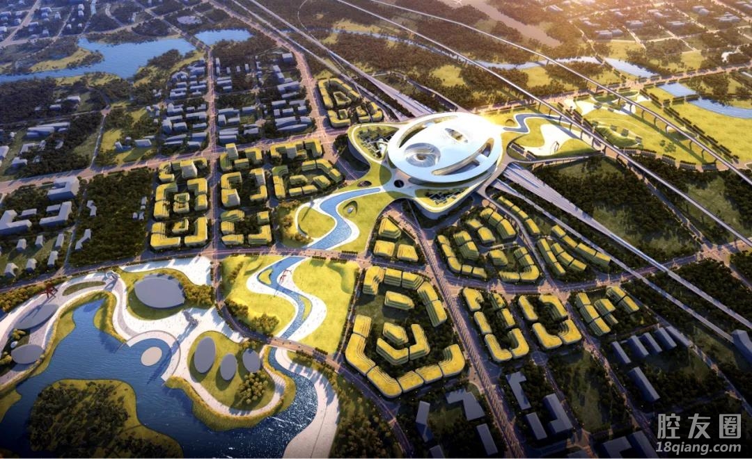 设计秉承景观都市主义理念,连接现状景观水系,打造之字绵延、抑扬起伏的大地艺术公园。以地景化的综合体开发藏风聚气,织补轻轨的斜向切割,从站前广场一眼望去是连绵不绝的公园绿地和波光粼粼的金满湖。以“绿谷明珠”为设计理念,椭圆形站房将两翼绿谷与城市客厅融为一体,为参差灵动的商贸开发底盘所承托。日字型站房宛如两山之间朝阳初升,既表达了地域文化中对太阳金乌的尊崇,也展现了四面八方和合融通的美好愿景。