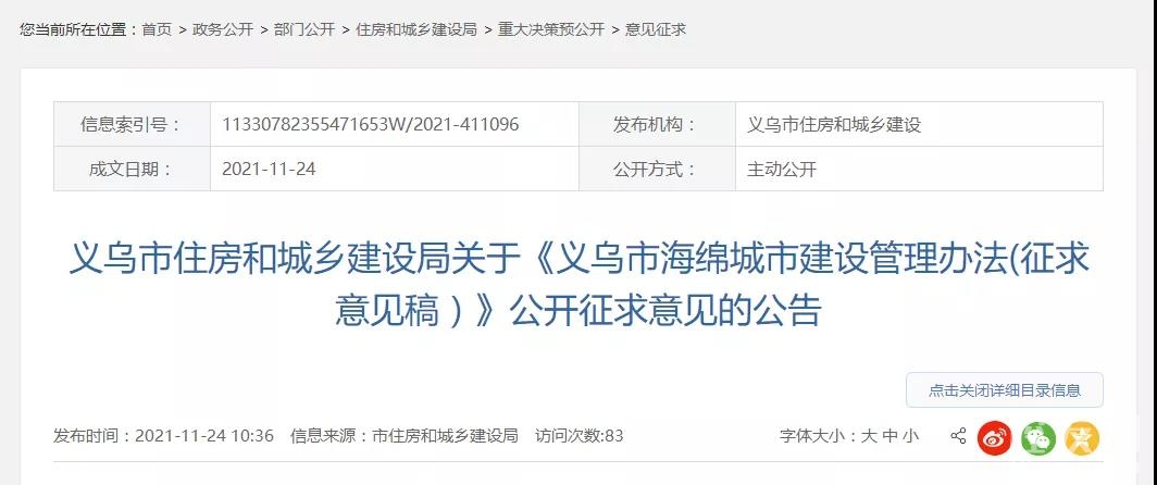 11月24日,市住建局发布关于《义乌市海绵城市建设管理办法(征求意见稿)》公开征求意见的公告,全文如下:
