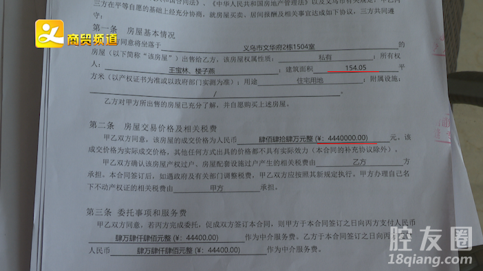 王宝林给记者看了他们的居间合同,从合同上可以看到,当时房屋的建筑面积是154.05个平方,以实际为准,后面约定了房屋的总价为444万元。