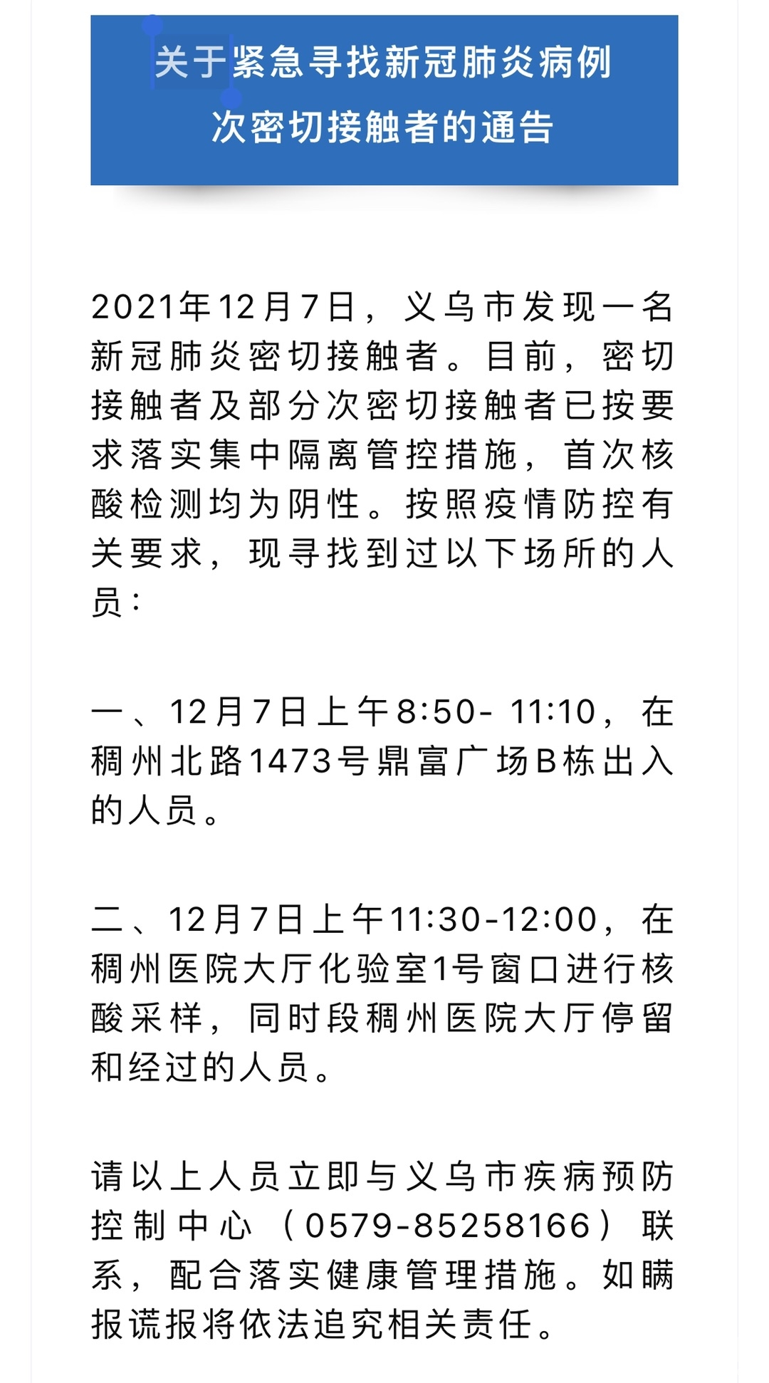 [义乌故事]关于紧急寻找新冠肺炎病例次密切接触者的通告 [复制链接]