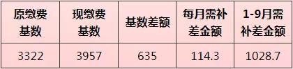 以原来最低缴费金额597.96元为例,每月需补差114.3元,1-9月共需补差1028.7元。