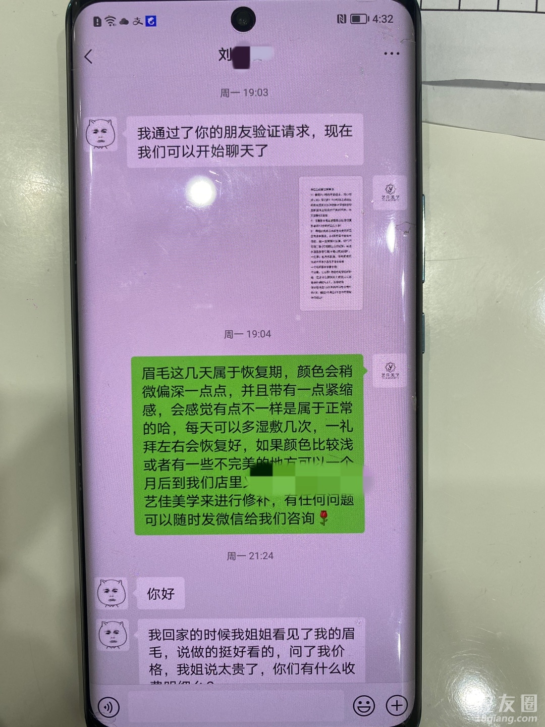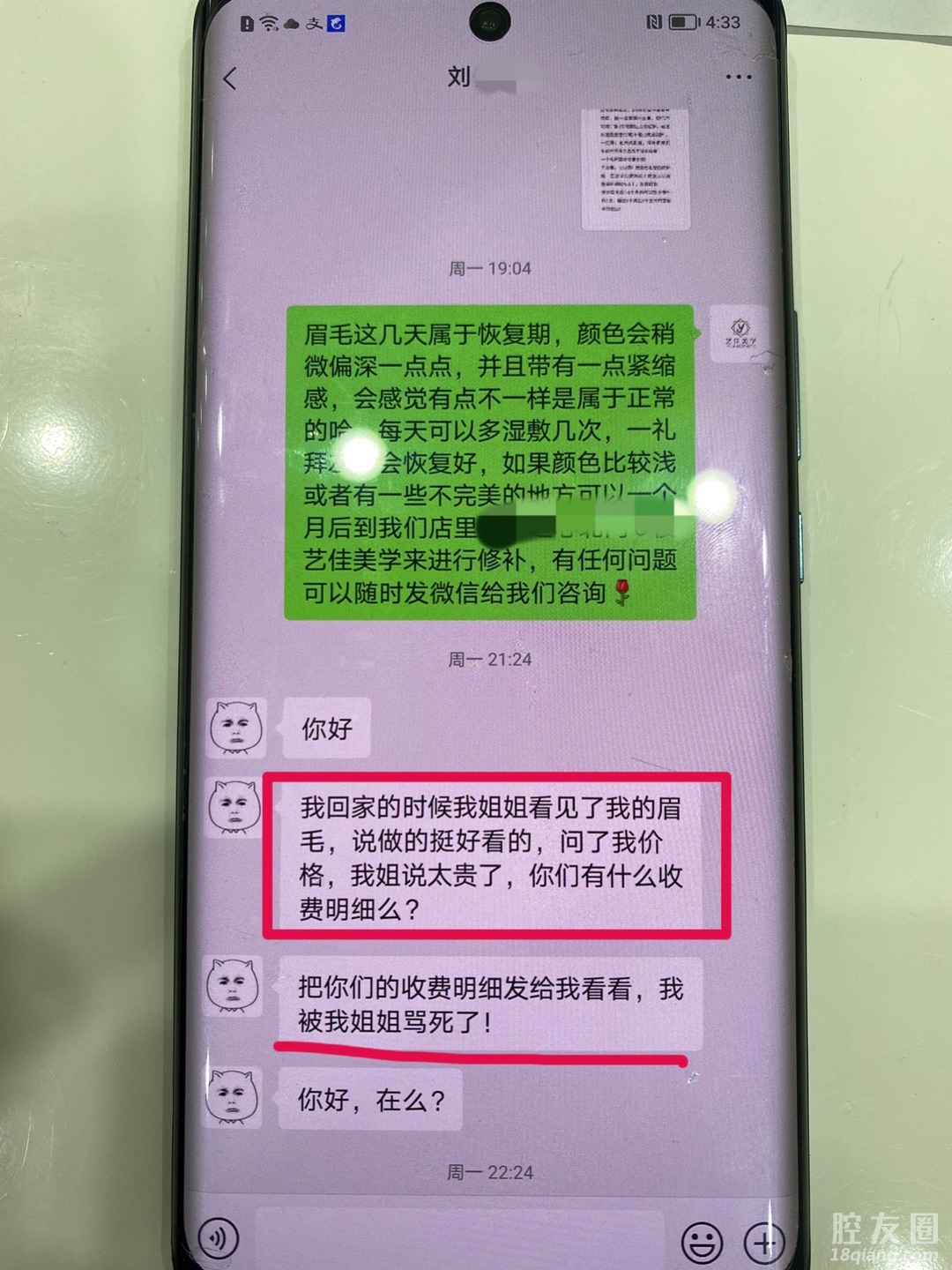客人姐姐带着当事人和自称也是某电视台上班的人在我们店里对接待人一恐吓轮番轰炸,有监控视频为证,一定要求退钱,在走了各种途径我们都是合理合法的情况下在十八腔这个平台对我们进行污蔑 我有聊天记录和付款时间图片为证,包括昨天一群人到在我们店的视频!如果在我们法治社会明明白白付钱消费并且满意的情况下想反悔就反悔想退钱就退钱,那么我们商家的权利谁来维护,楼主对我们店里造成的负面影响是需要付法律责任的,聊天记录和付款记录可以为证,做完眉毛是晚上7点多添加的我们微信,全程都是客人的姐姐在代表她妹妹来描述,我也希望有人能维护我们商家的权益,每个成年都要为自己的行为负责任,不然我们的法律何在