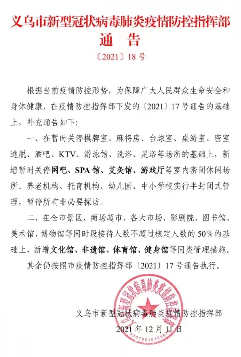 义乌市新型冠状病毒肺炎疫情防控指挥部通告(2021年第18号)
