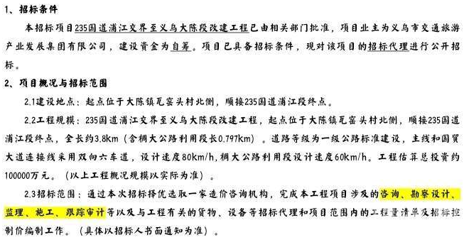 本招标项目235国道浦江交界至义乌大陈段改建工程已由相关部门批准,项目业主为义乌市交通旅游产业发展集团有限公司,建设资金为自筹。项目已具备招标条件,现对该项目的招标代理进行公开招标。