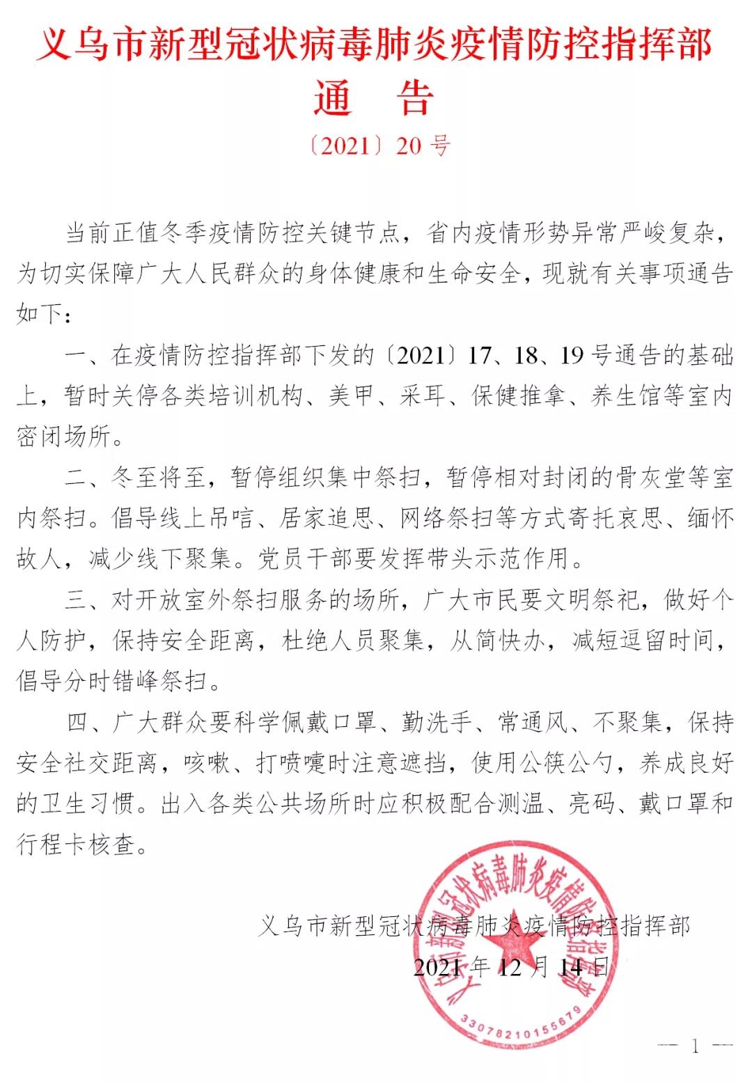 〔2021〕20号 义乌市新型冠状病毒肺炎疫情防控指挥部通告: