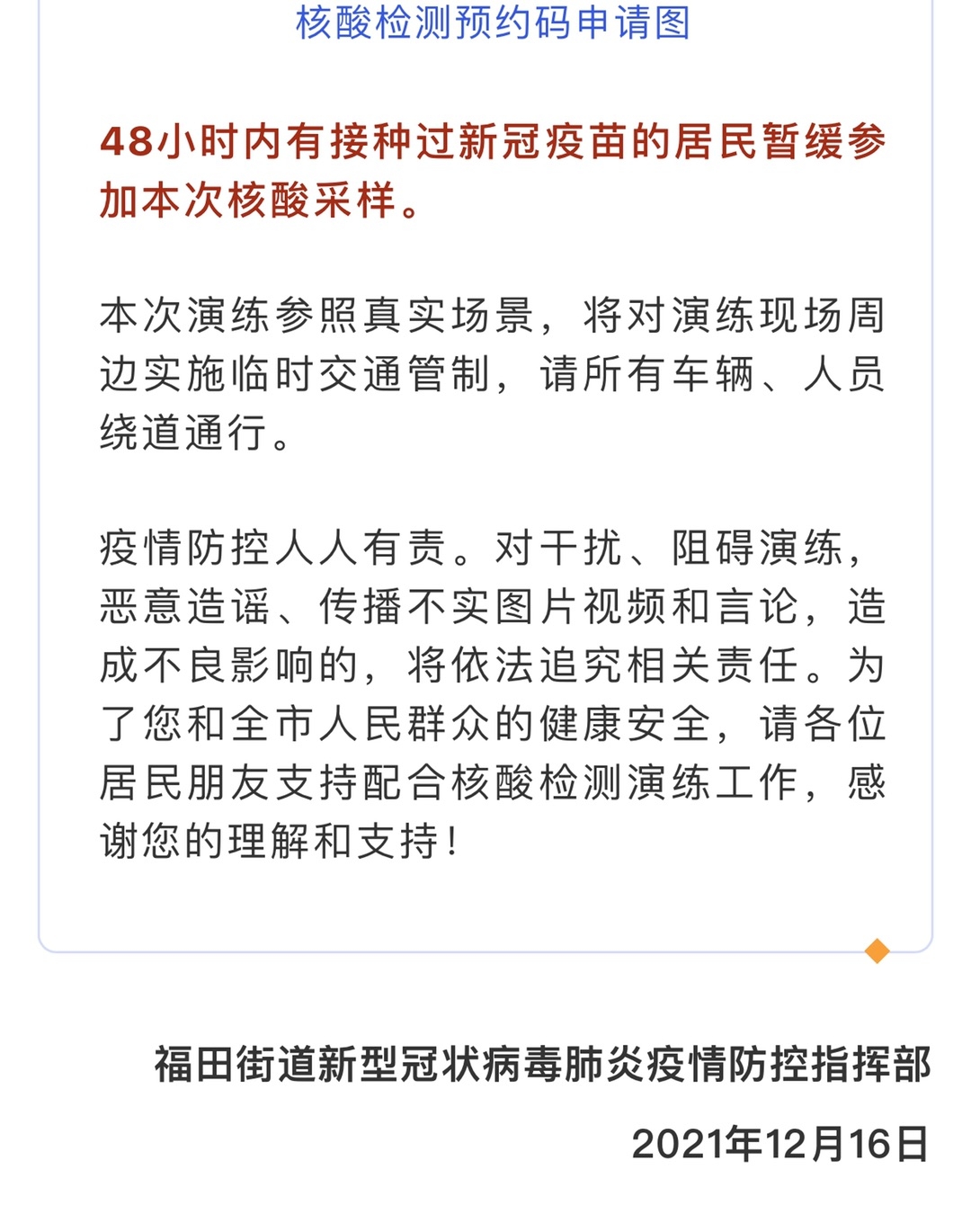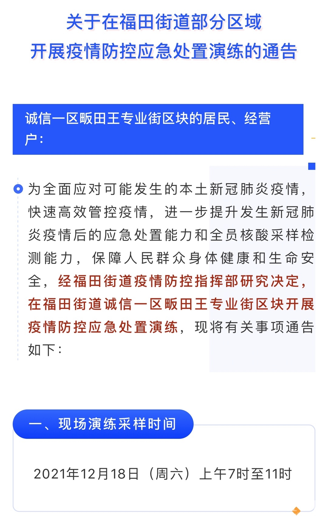 关于在福田街道部分区域开展疫情防控应急处置演练的通告
