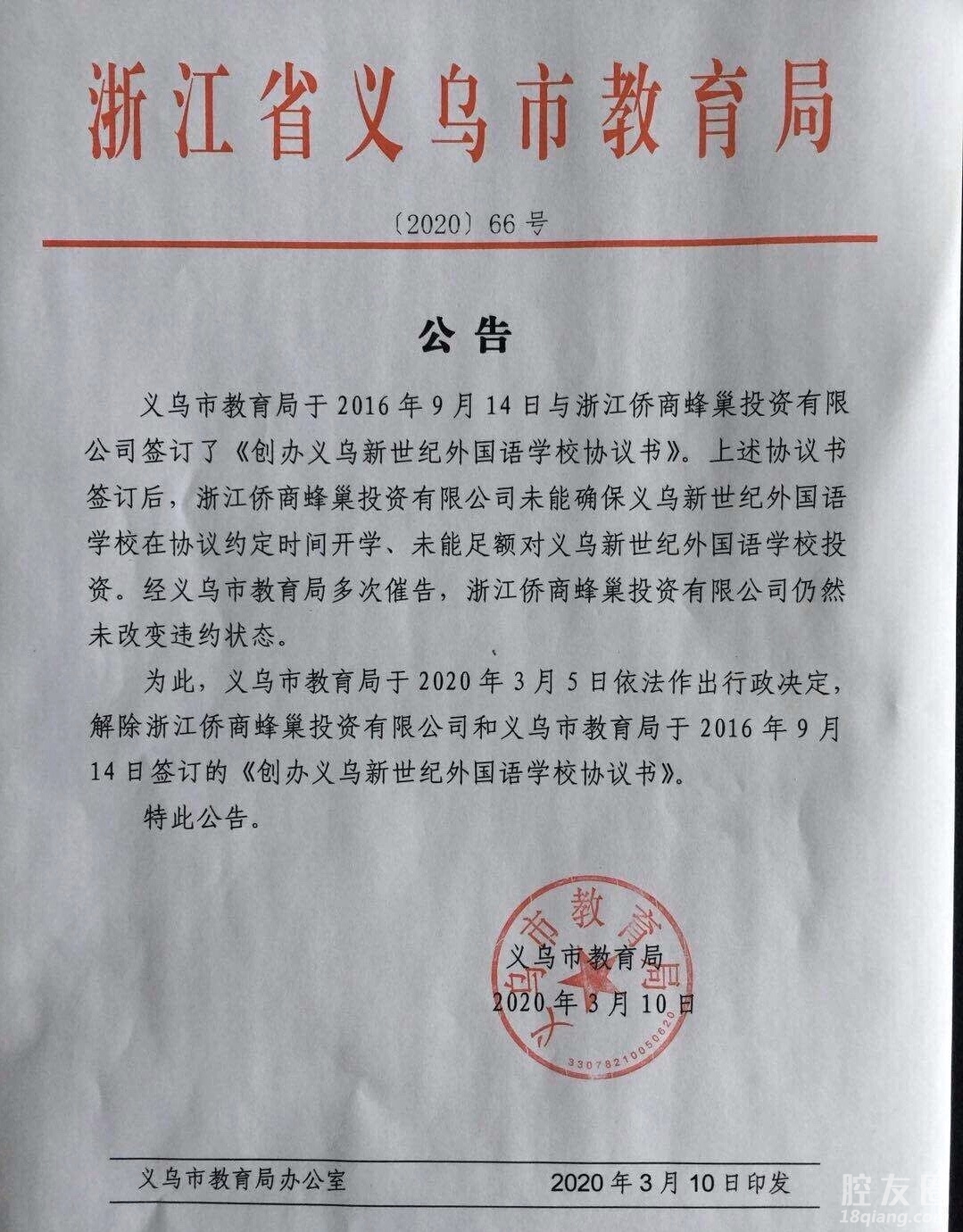 义乌市教育局已于2020年3月5日作出解除与浙江侨商蜂巢投资有限公司签订的《创办义乌新世纪外国语学校协议书》的行政决定。浙江侨商蜂巢投资有限公司不服该决定遂提起行政诉讼。义乌市人民法院一审和金华市中级人民法院二审行政诉讼,均对义乌市教育局的行政决定予以维持。现浙江侨商蜂巢投资有限公司继续办学的前提条件已经丧失,义乌新世纪外国语学校应当终止。