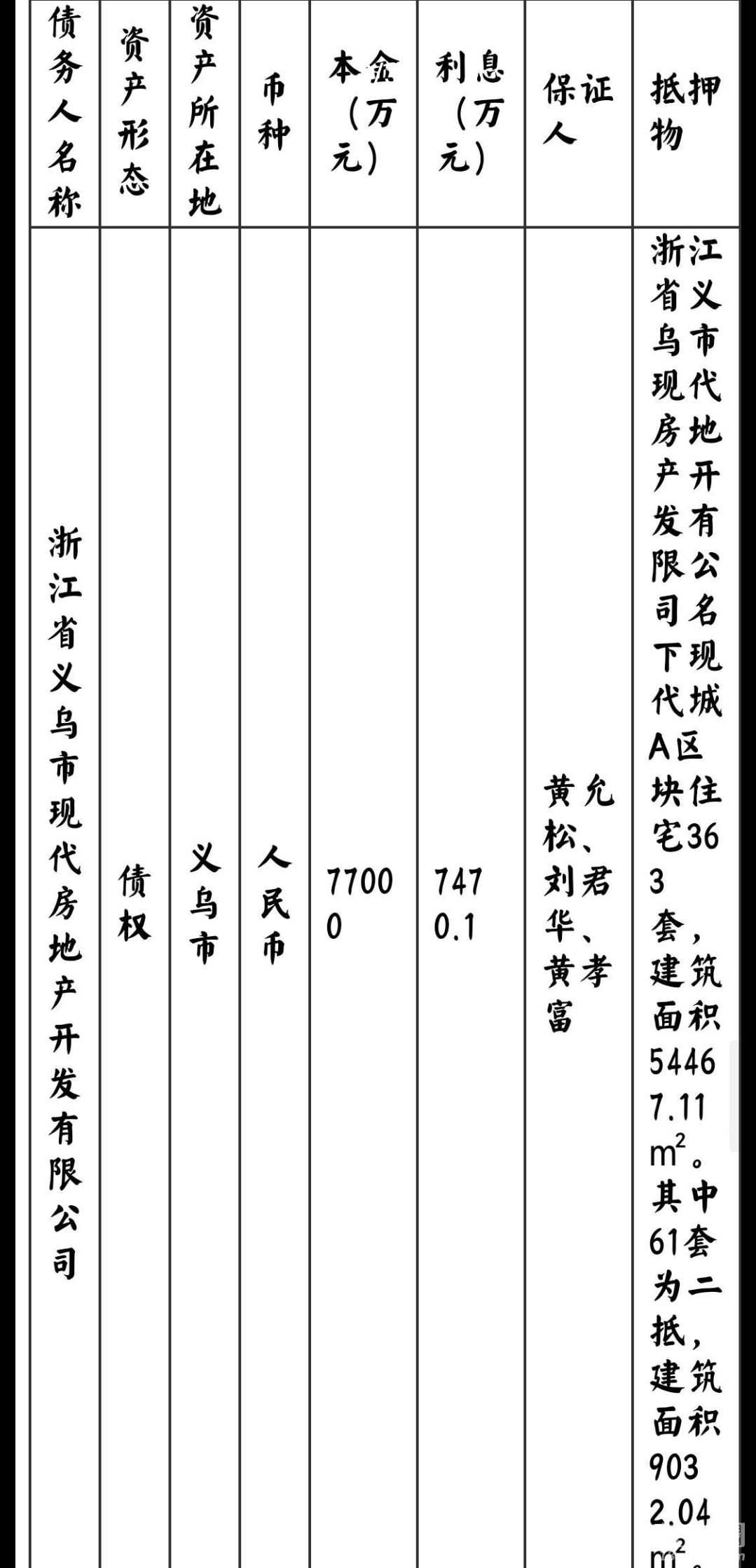债权抵押物为浙江省义乌市现代房地产开发有限公司名下现代城A区块住宅363套,建筑面积54467.11㎡,其中61套为二抵,建筑面积9032.04㎡。