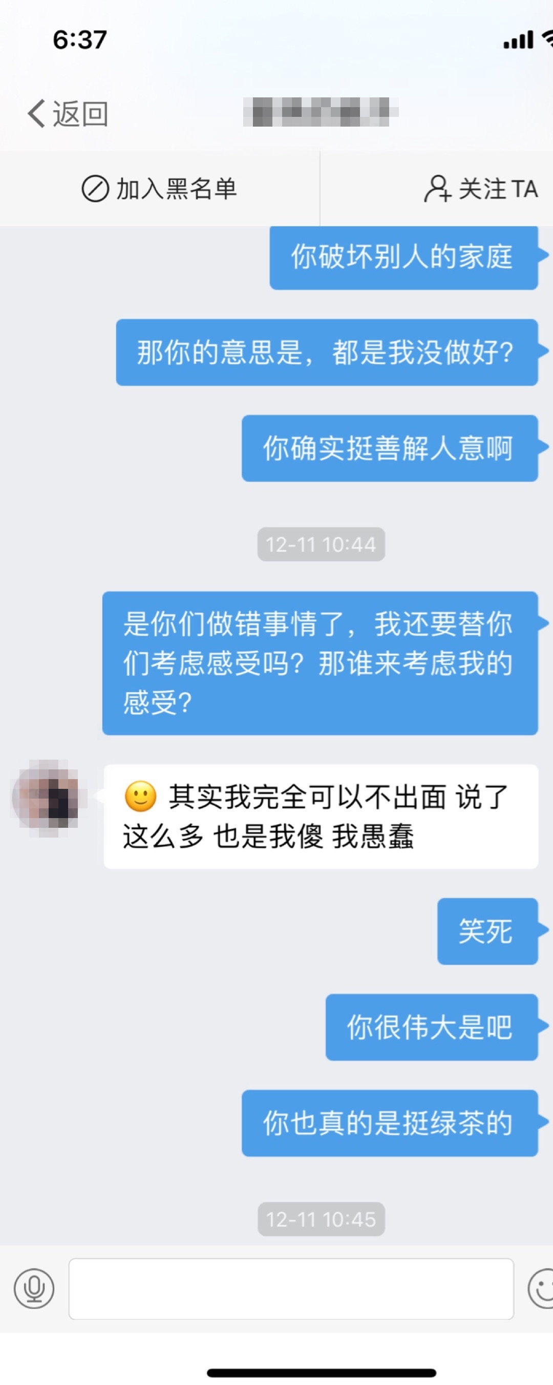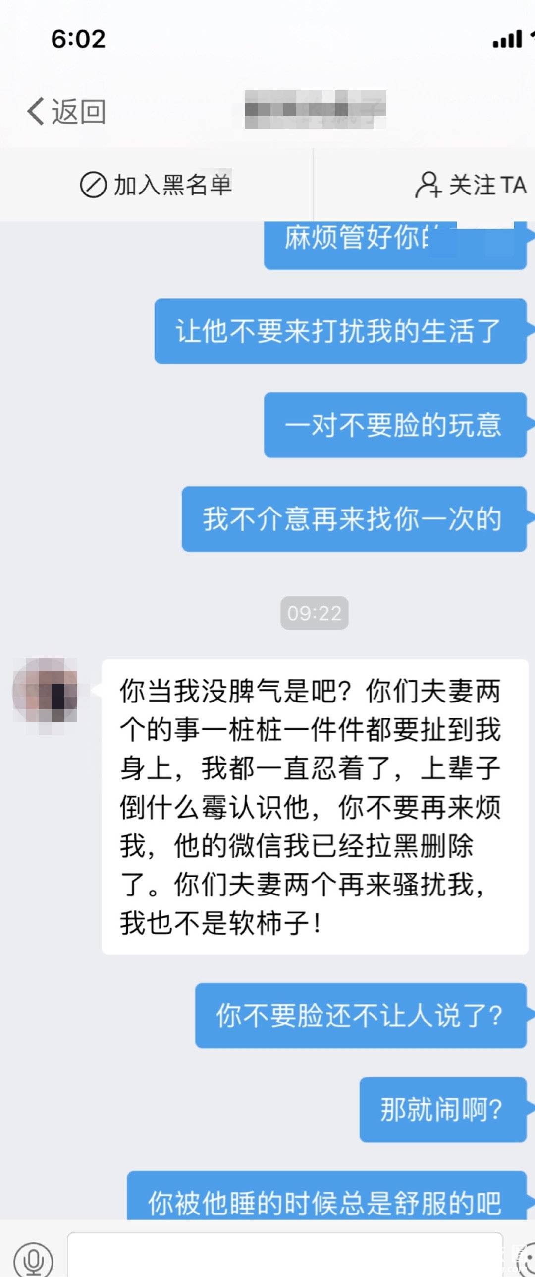 总之就是事发到今天,我也不知道你们何时结束的,男人12.11出去到12.28才回家,我也懒得联系,应该是跟你在一起的吧!回家就找我麻烦所以我也来找你了,让你管好这个狗男人,你这么喜欢我送你了反正,结果人家哈哈哈哈理直气壮!