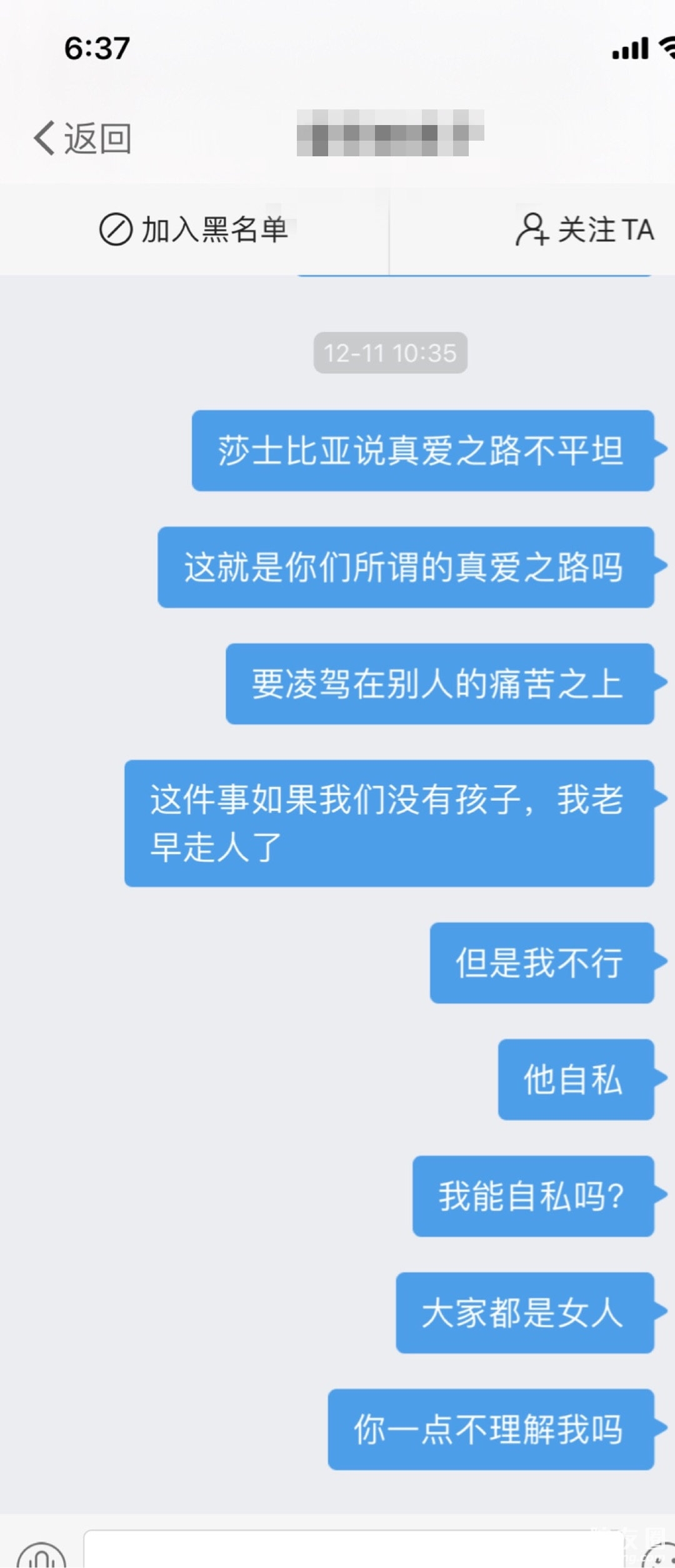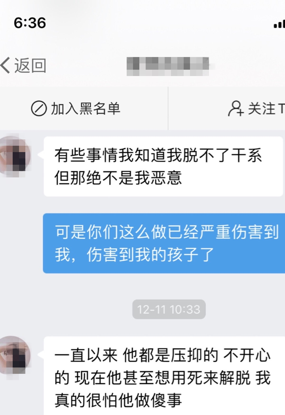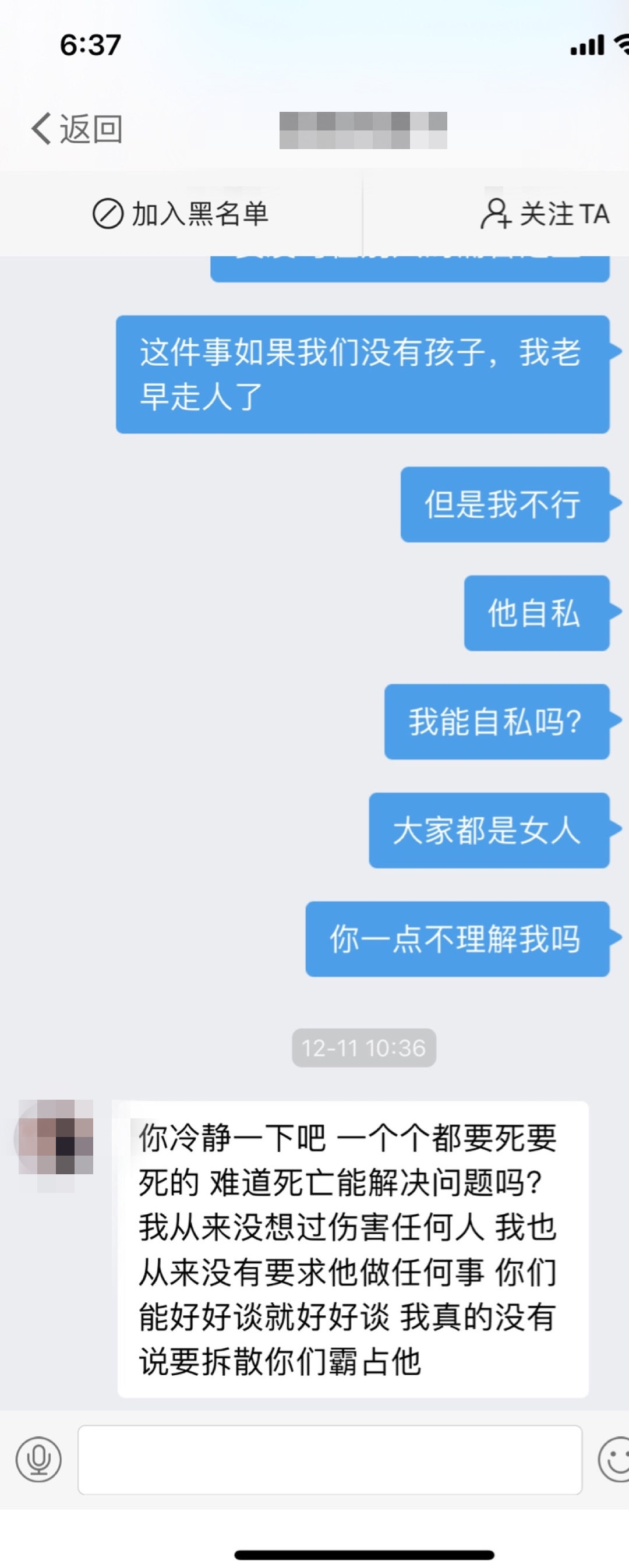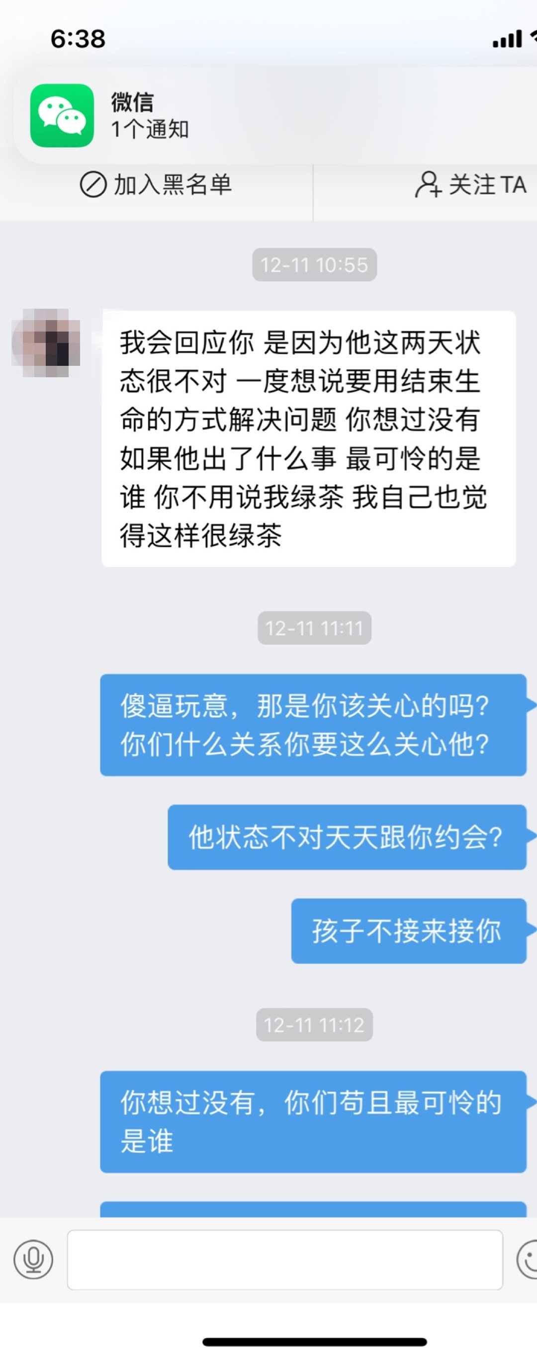 我12.11号私信完小三,男人就给我打电话了,我们那天谈好了离婚事宜,准备等着周一去签冷静期,结果第二天男人就去出幺蛾子了,要去寻死,我也无所谓!我只是给你发了个消息我说他如果真出事你脱不了干系,结果小三也本事,发了一张割腕的图片说在尽力劝男人回来了!