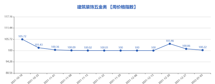 建筑装饰五金类本周价格指数100.22点,持续回调。近期,建筑装饰五金类产品整体销势平稳。内销方面,多头插座、漏电保护插头、稳压器等实用性电工产品销势良好,采购商下单频繁,主要销往上海、金华等地区;防止氧化、做工精良的中档水暖产品成为销售主力,受到各地采购商喜爱。外销方面,各类电工产品、五金水暖产品进入销售调整期,止水阀、地漏、软管等配套产品销量表现平平。